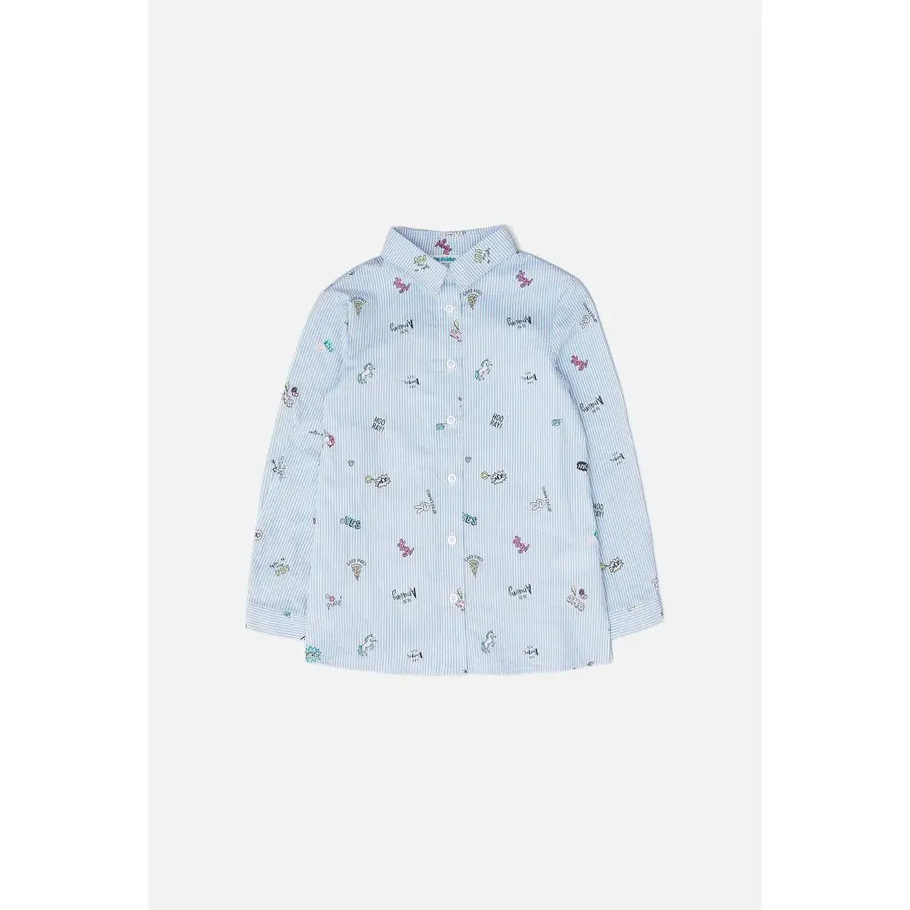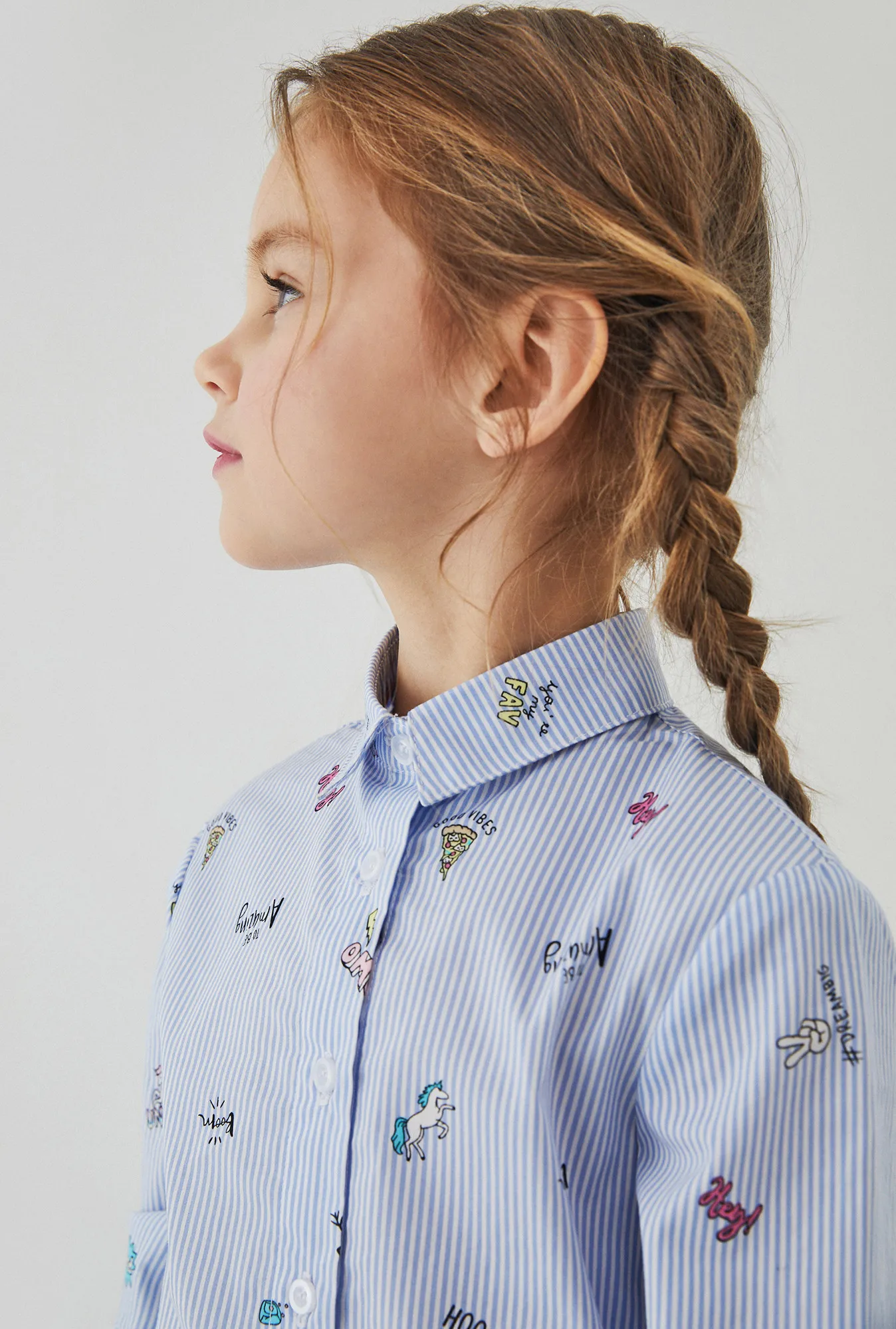 Рубашка для девочки в узкую серо-белую вертикальную полоску с принтом в стиле поп-арт выполнена из натурального, гипоаллергенного, приятного к телу и «дышащего» материала. Рост/размер одежды модели на фото: 110.