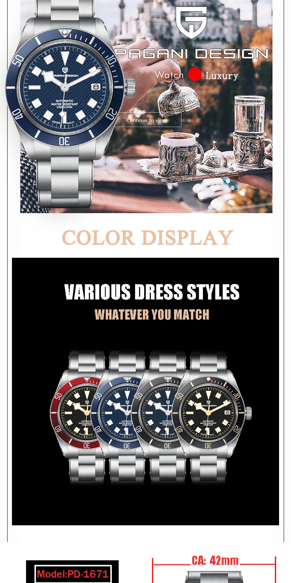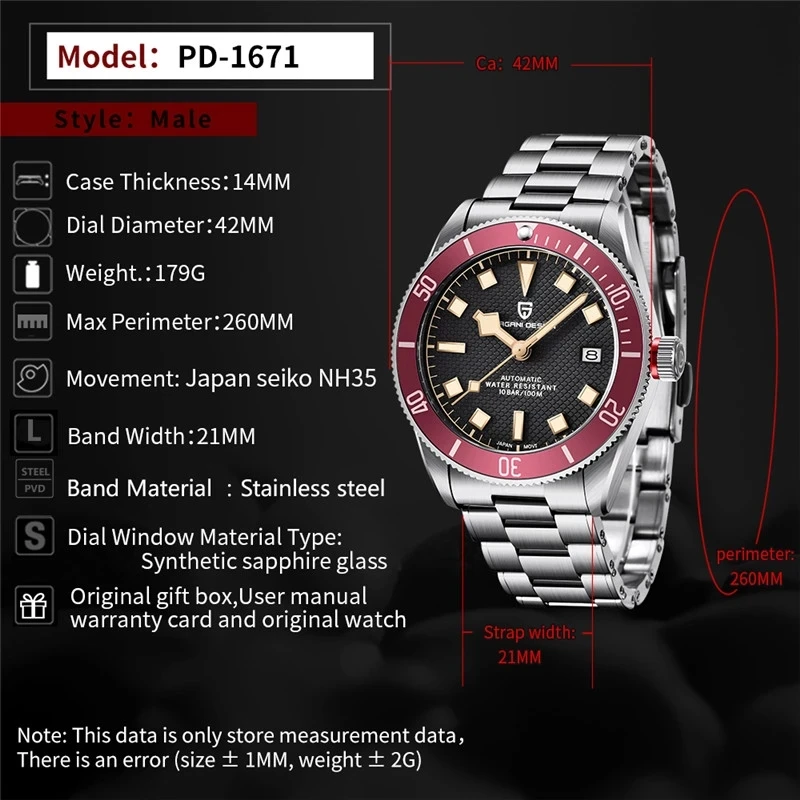 Модель: PD-1671Механизм: Япония Seiko NH35A [автоматический механический механизм]Чехол: материал-нержавеющая сталь 316L, процесс рисования42 мм в диаметреДлина 48 ммТолщина 13 ммШирина ремешка 20 ммСтекло: сапфировое стеклоБезель: анодированный алюминиевый дефлектор, световой знак 12 часовЦвет циферблата: матовый черный, матовый синий, матовый красный, матовый черный и синийСтрелки: ретро Снежинка руки, светящееся покрытиеСветящийся: Ретро светящийся эффект BGW-9 синий светильник, стрелки и маркерыКорона: заводная головка с 3D логотипом бренда с глубоким прессованным узоромЧехол на заднюю панель: прозрачная нижняя крышка с винтомРемешок: твердый браслет из нержавеющей стали 316L с заклепкамиЗастежка: Складная безопасная пряжка с логотипом PAGANIВодонепроницаемость: 10 бар = 100 метровВес: около 145 г