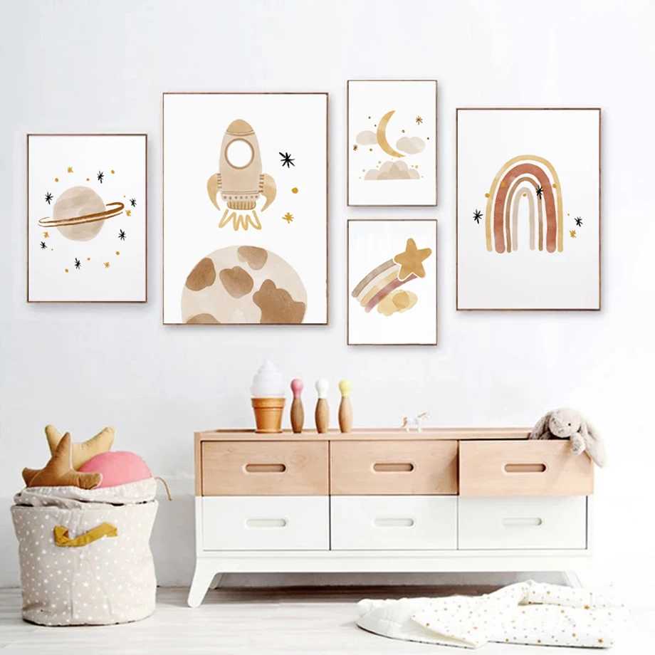 Настенная картина в стиле бохо, планеты, ракеты, звезды, луна, радуга, солнце, настенные картины на холсте, скандинавские плакаты и принты, настенные картины, декор для детской комнаты