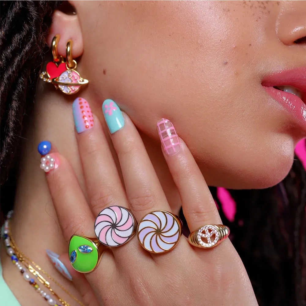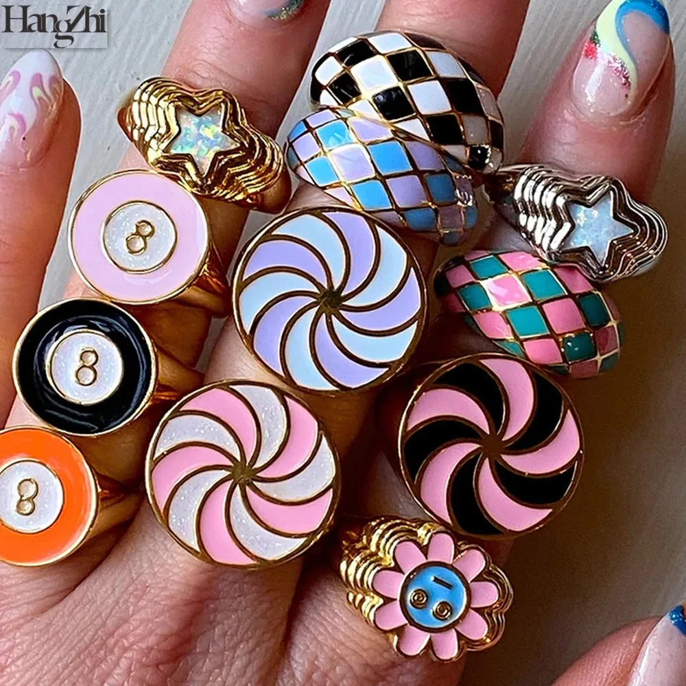 HangZhi 2021 Новые красочные ветряные мельницы гиперболы крупные геометрические круглые кольца с цветком звезды для женщин улыбка Гал кольцо Модные ювелирные изделия