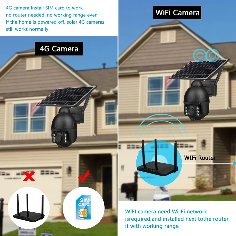 4G камера устанавливает SIM-карту для работы, роутер не нужен, рабочий диапазон отсутствует, даже если дом выключен, солнечные 4G камеры все еще работают нормально. Для Wi-Fi-камеры требуется Wi-Fi сеть, и она установлена рядом с роутером, с рабочим диапазоном