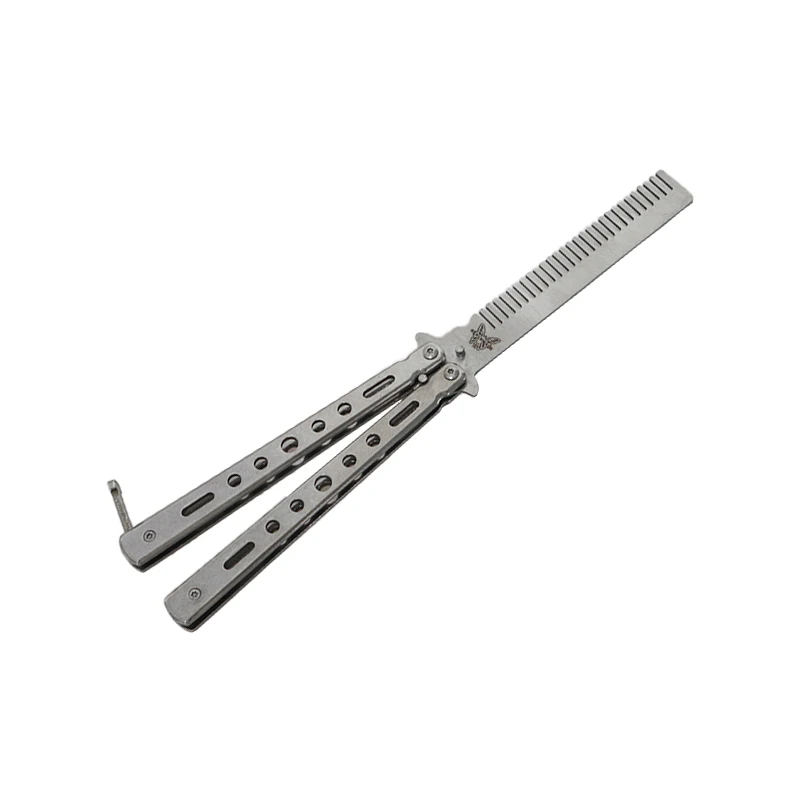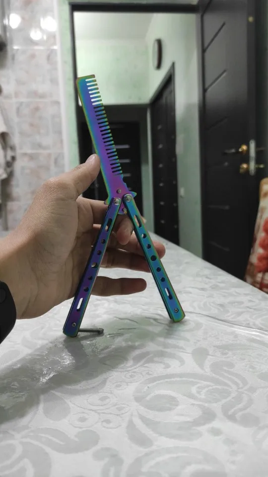Спецификация: Тип товара: расческа для ножей с бабочками Материал: нержавеющая сталь. Цвет: как показано Дизайн: складной Размер в открытом виде: 1,18x8,66 дюймов