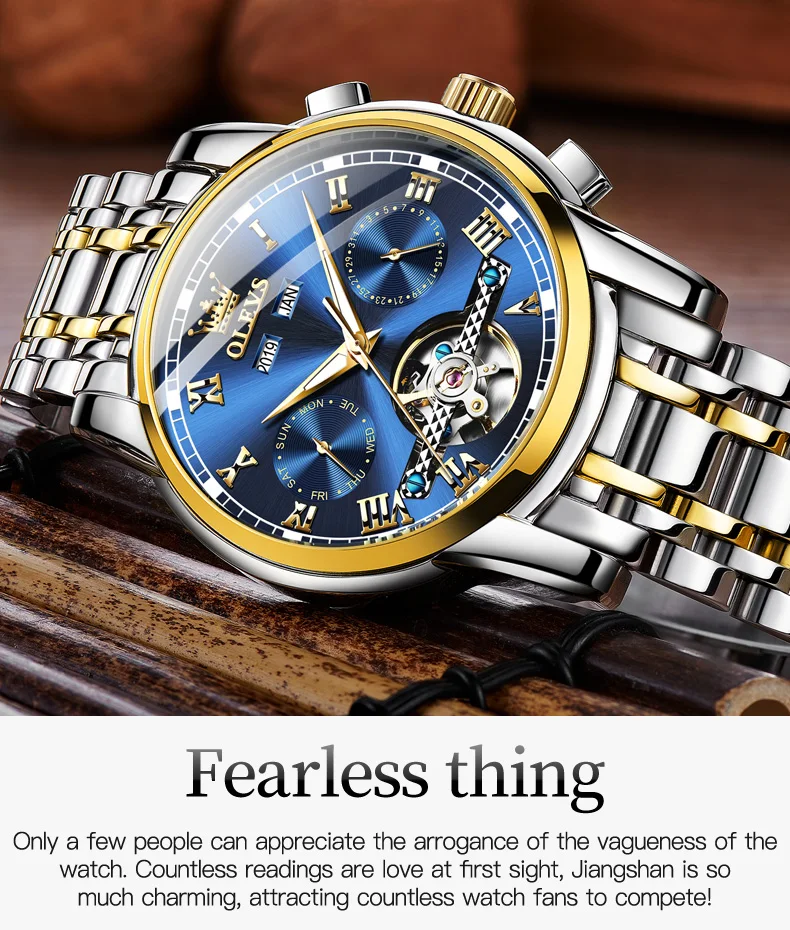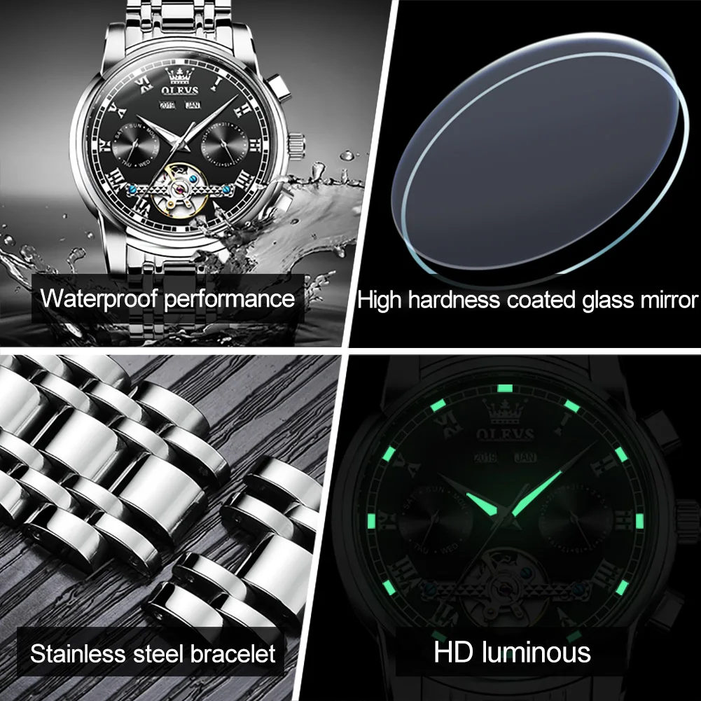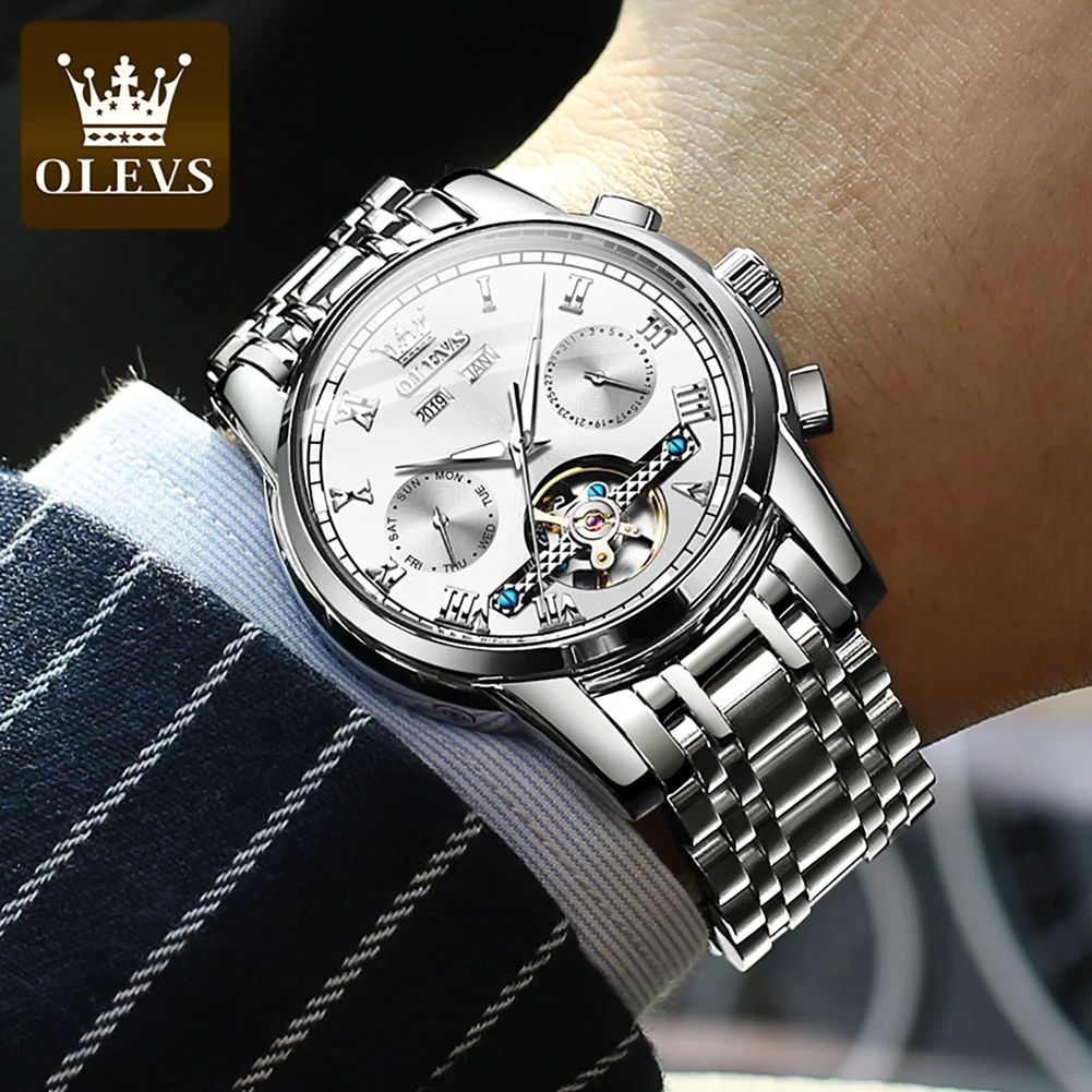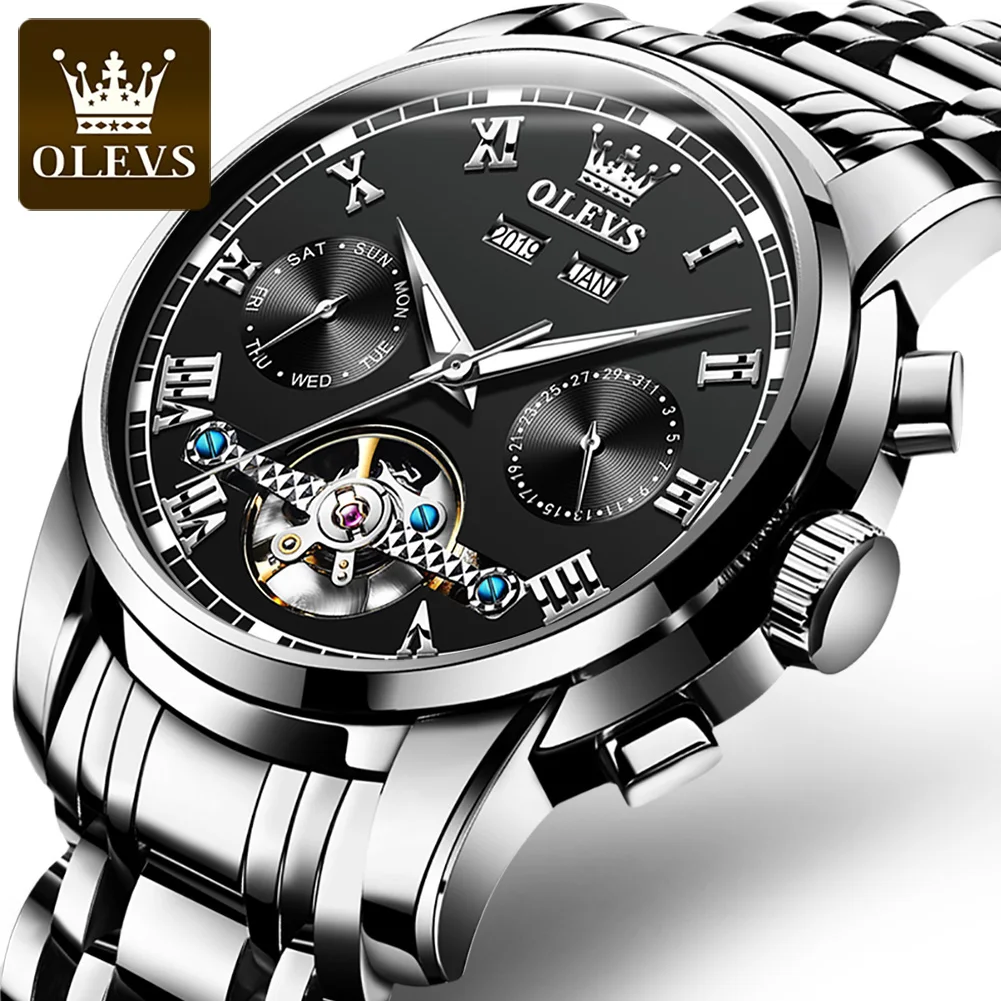 OLEVS Для мужчин смотреть автоматические механические часы из нержавеющей Топ Брендовое платье Роскошные фаза Луны Tourbillon наручные часы Подарки для мужчин