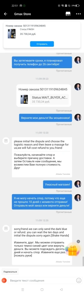 Продавец мошенник! С начало долго не отправлял телефон, под конец времени обработки заказа я обратился с вопросом в чем причина не отправки, после чего начались бесконечные предложения со стороны продавца о замене цвета на синий. В итоге продавец "типа отправил" заказ, но не указал трек-номер и по новой начал предлагать замену цвета. В итоге никаой отправки не было, открыл спор, вернул деньги. Очень жаль, более 20 дней просто потерянного времени пока вернул деньги. Не место этому продавцу на AliExpress! Скрин переписки с продавцом прилагаю.