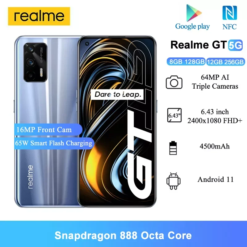 Realme GT 5G NFC мобильных телефонов 6,43 "Snapdragon 888 Octa Core 4500 мАч Батарея 64MP AI тройные камеры Android 11 смартфонов