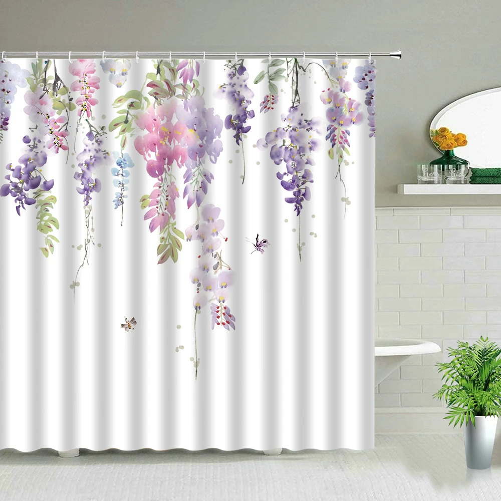 Занавеска для душа с цветочным принтом, s Весенняя декоративная занавеска для ванной комнаты, с крючками, фиолетовая, розовая, с бабочками