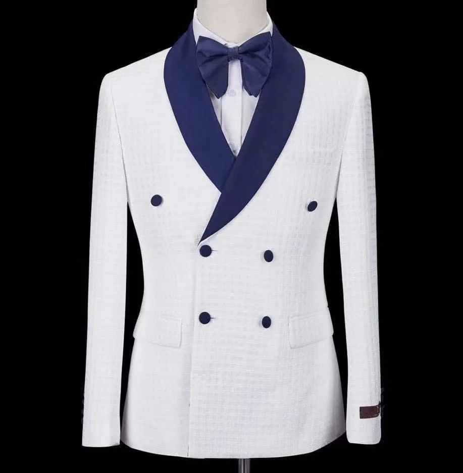 Белый двубортный Свадебный костюм для мужчин с синим дуги с лацканами Тонкий 2 шт жениха шафера Праздничная мода Повседневный Блейзер брючные костюмы