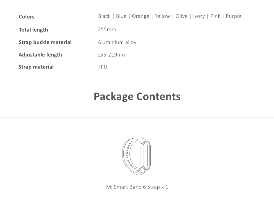 > Технические характеристики:-Цвета: черный/синий/оливковый/слоновая кость/розовый/фиолетовый/оранжевый/желтый-Материал ремешка: термопластичный полиуретан (ТПУ)-Материал пряжки ремня: алюминиевый сплав-Общая длина: 255 мм (10 дюймов)-Регулируемый Длина: 155-219 мм (6,1-8,6 дюймов)> Эта ссылка продает только оригинальные ремешки на запястье, без устройства Mi Band 6!