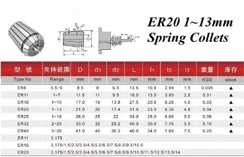 Номер моделиER20 1mm 2mm 3mm 4mm 5mm 6mm 7mm 8mm 9mm 10mm 11mm 12mm 13mm