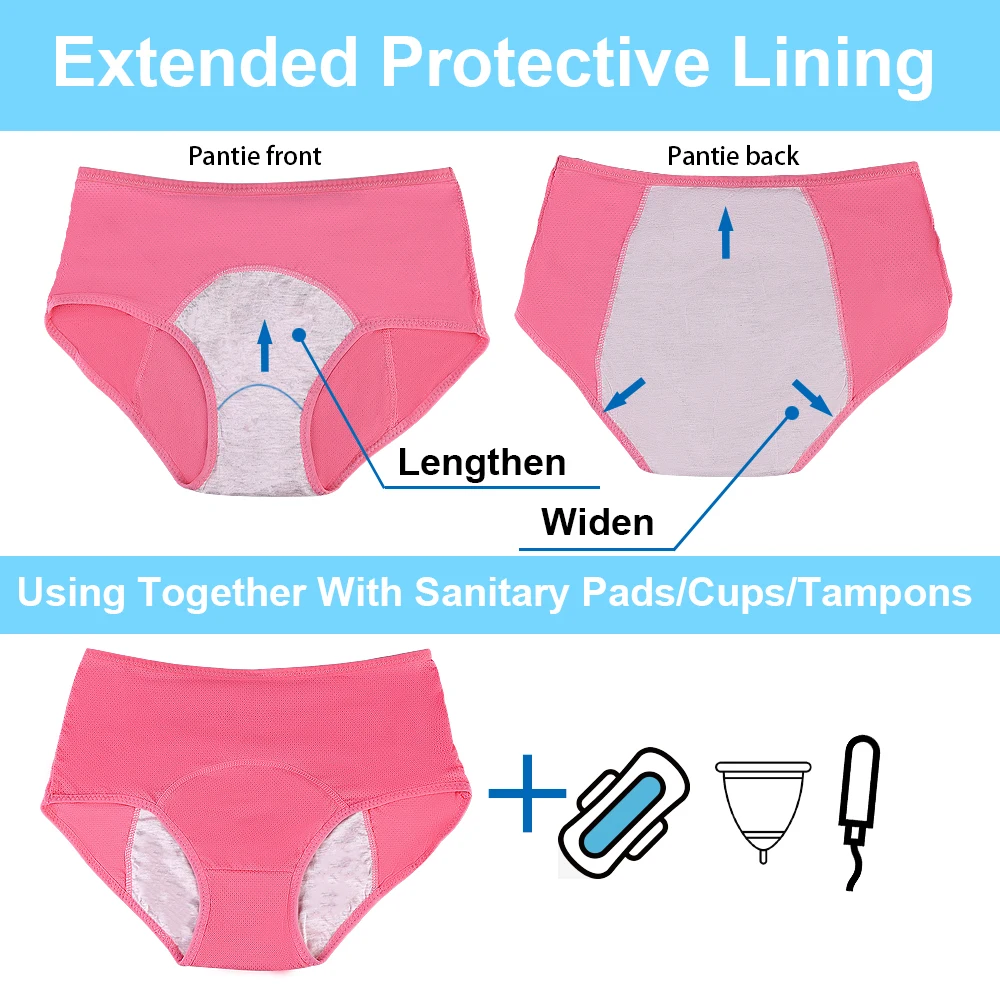 Наши трусики имеют три слоя, расширяют и удлиняют герметичную ткань спереди и сзади. Более широкий и длинный герметичный слой покрывает от промежности до спины, эффективно предотвращает появление утечки на ваших штанах, платьях или юбках во время менструации. Избавьтесь от смущения неожиданной утечки.