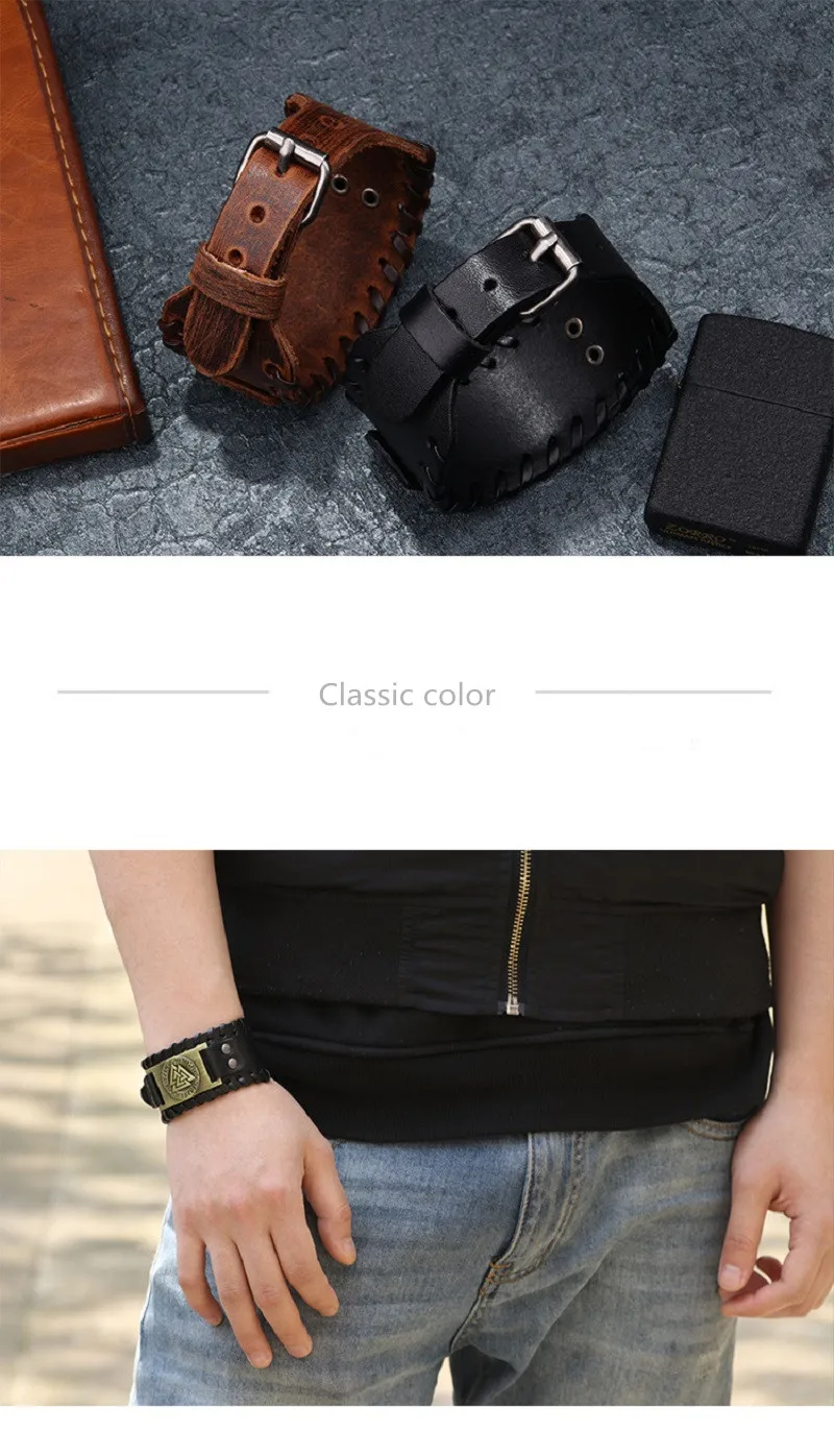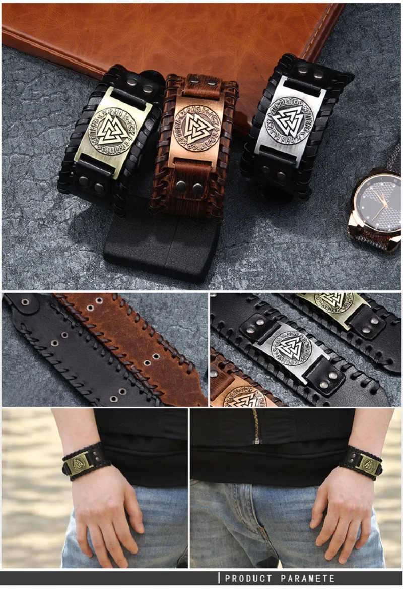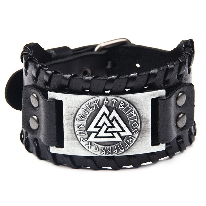 Винтажный широкий кожаный браслет Тотем викингов для мужчин, треуго...