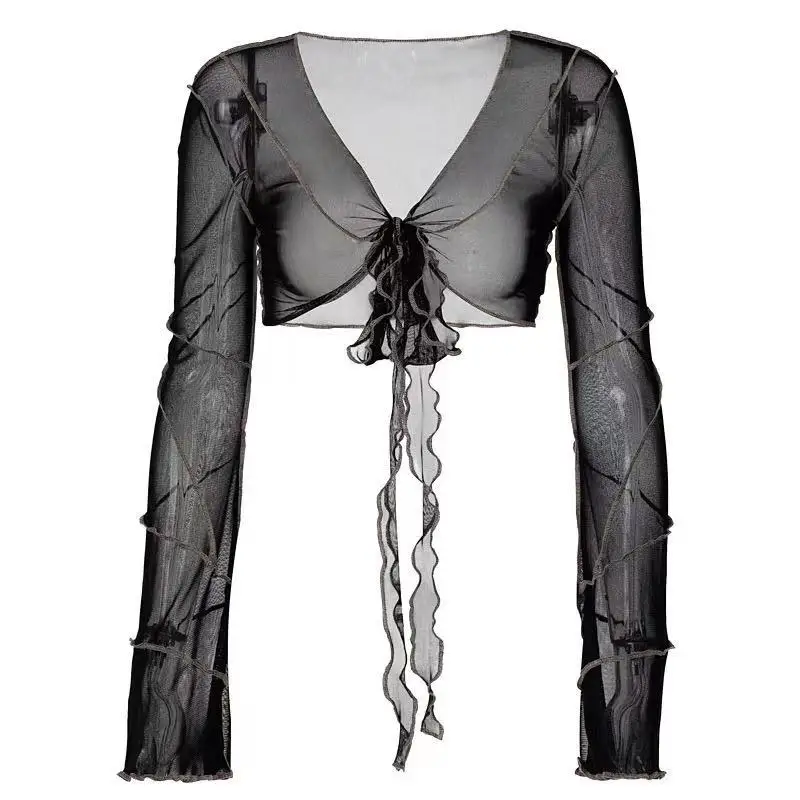 Черные Сетчатые кроп-топы, пастельные, готические, с глубоким v-обр...