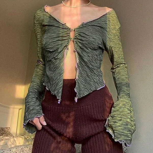 Y2k Топ 2021 сказочное летнее гранж с v-образным вырезом и расклешенными рукавами, рюшами и разрезом кроп-топы на рост 90s эстетика кнопка-зеленые футболки Сексуальная футболка Винтаж