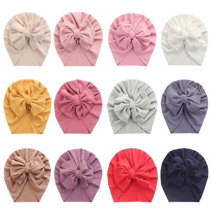 Однотонные ребристые шапки-тюрбан с бантиком для маленьких мальчиков и девочек, шапочки в полоску, тонкие эластичные крышки, головные уборы для новорожденных, От 0 до 4 лет для малышей