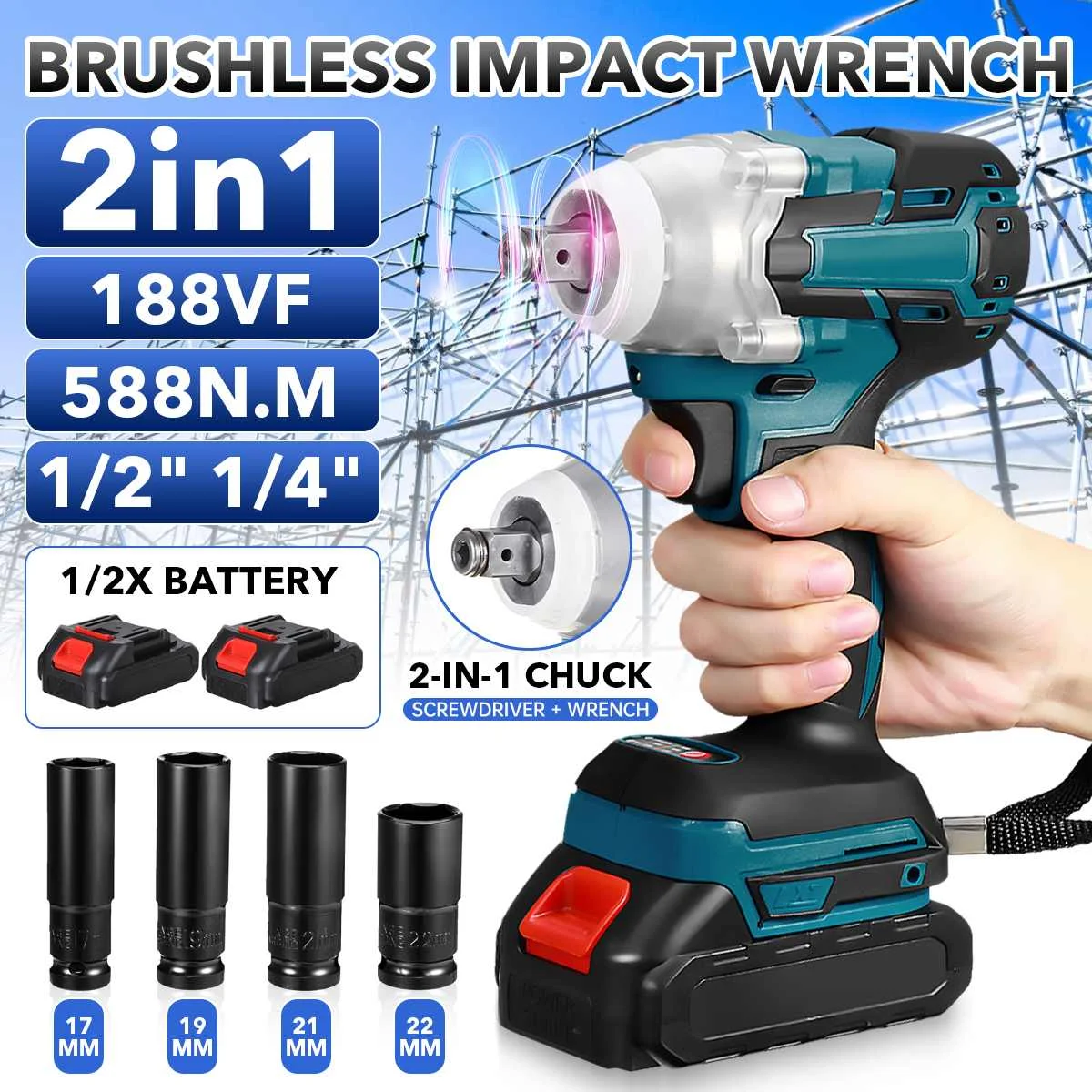 2 в 1 188VF 588N.m. Литий-ионный бесщеточный беспроводной электрический 1/2 "гаечный ключ 1/4" отвертка дрель