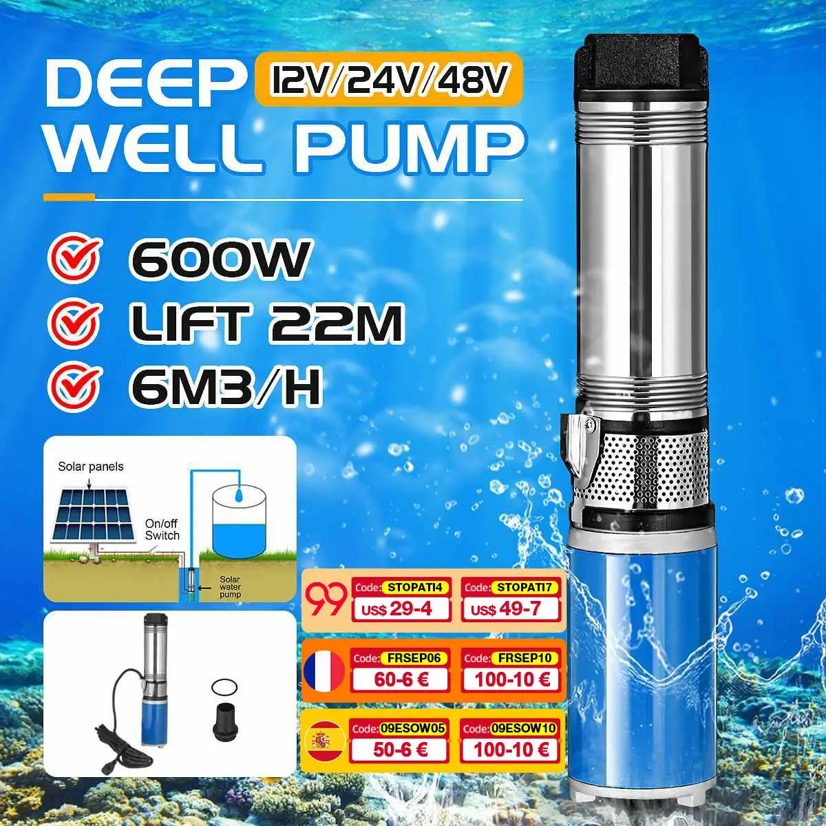 Новый водяной насос на солнечной батарее, 22 м, 12 В, 24 В, 48 В, 600 Вт, насос для глубоких скважин с высоким подъемом, погружной насос с винтом постоянного тока для сельскохозяйственного орошения, сада, дома