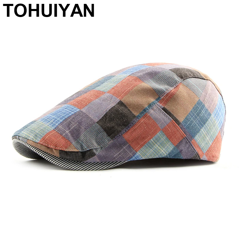 TOHUIYAN в клетку на плоской подошве Кепки s для Для женщин женский берет хлопок береты Шапки для мужчин Регулируемая в армейском стиле, с закруглёнными краями и пуговицей сверху Кепки драйвер с соской козырек шляпа в стиле Гэтсби
