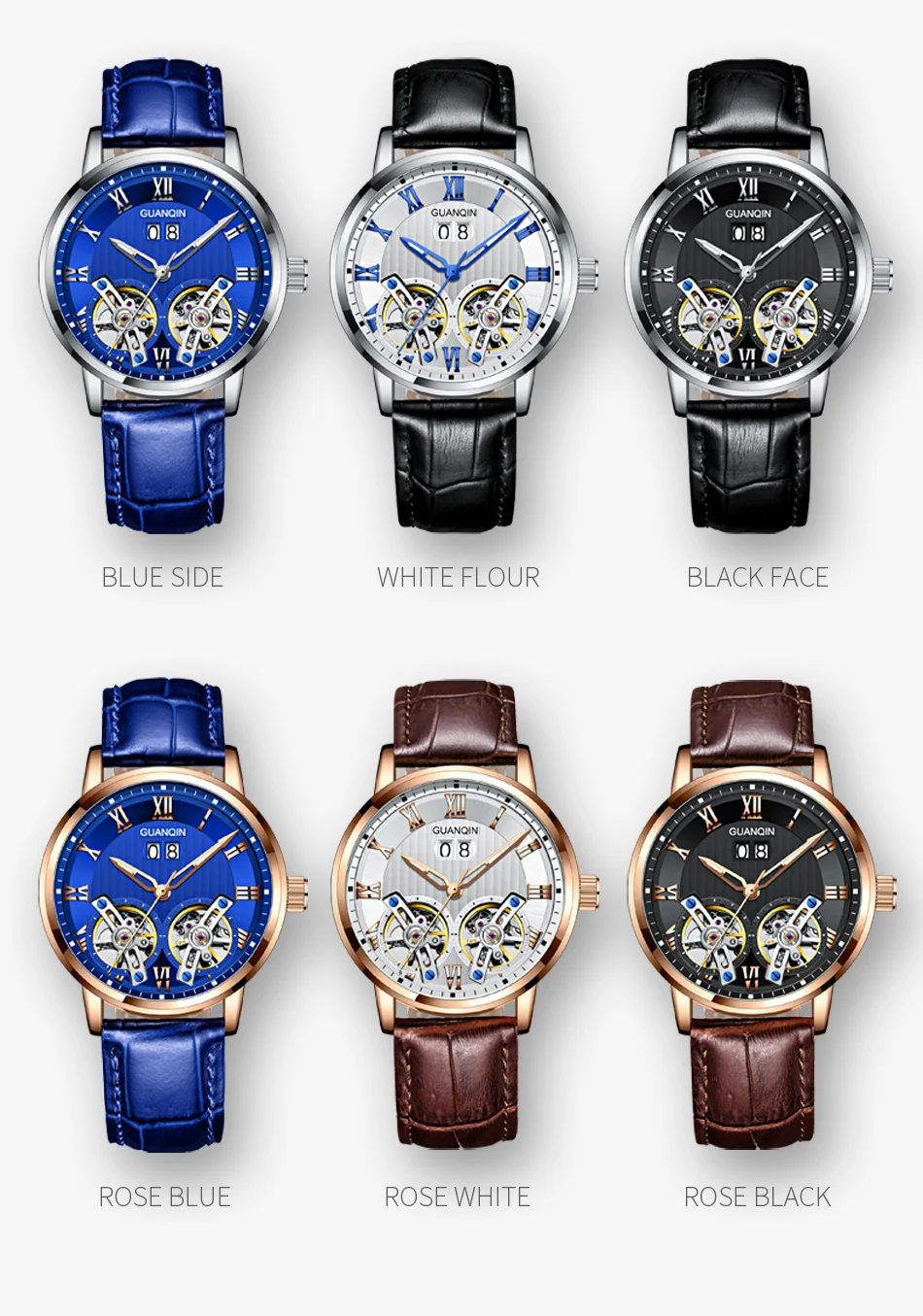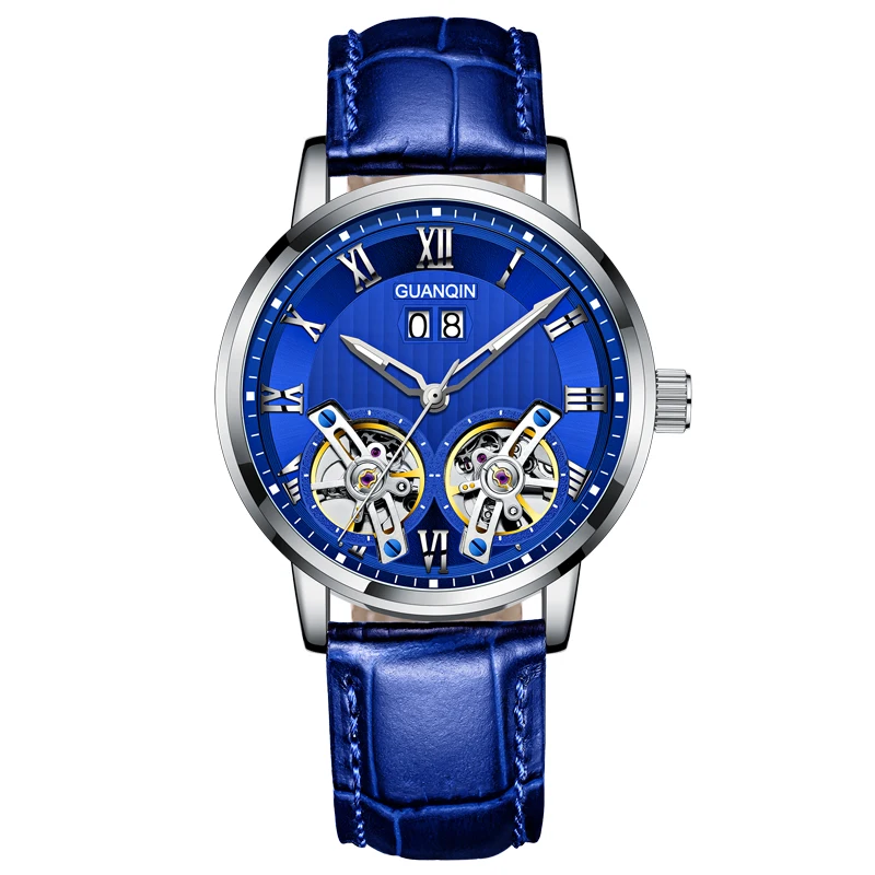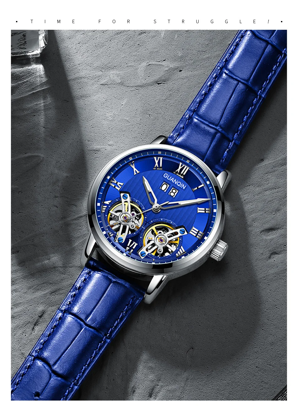 Мужские часы GUANQIN GJ16157, двойные автоматические механические часы Flywheels, водонепроницаемые светящиеся синие часы 5atm с датой и кожаным ремешком