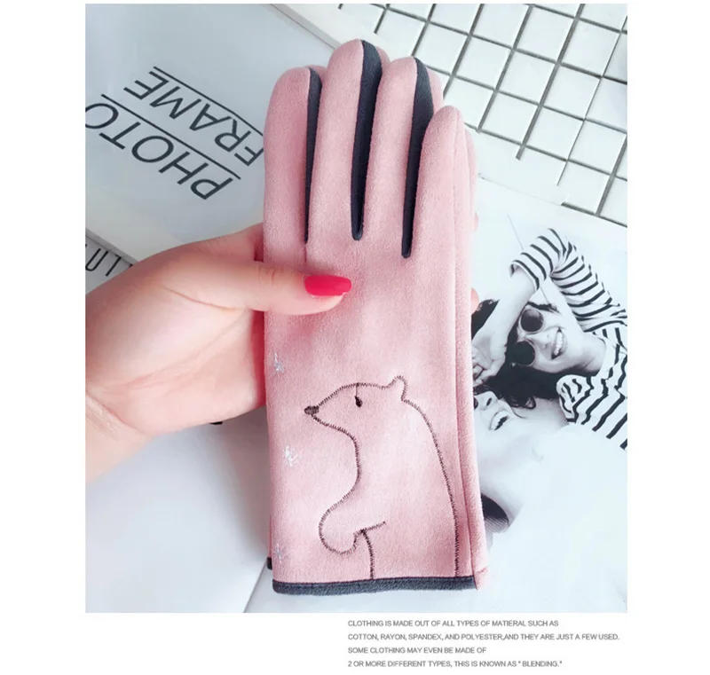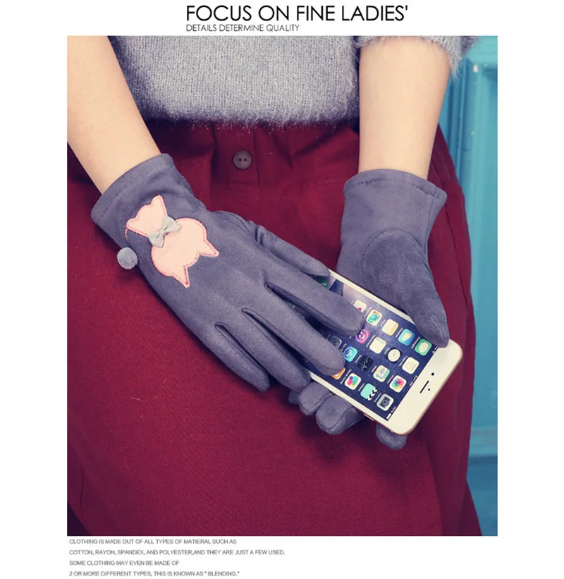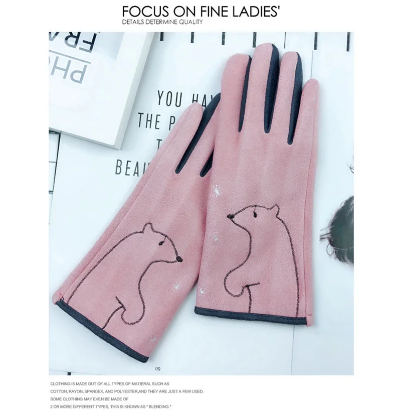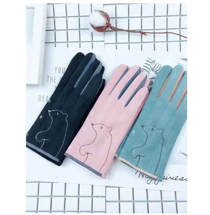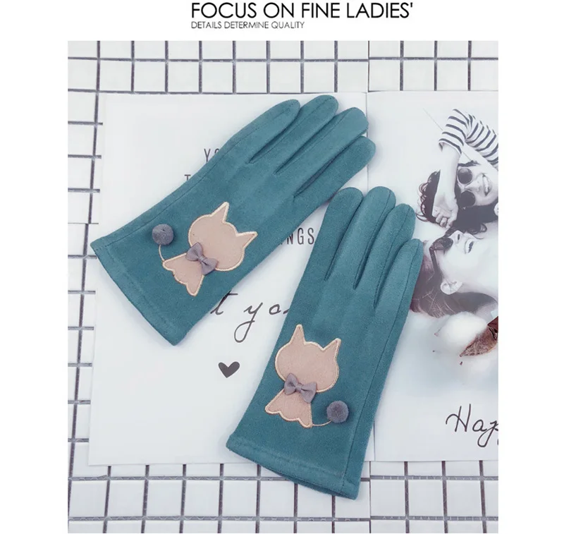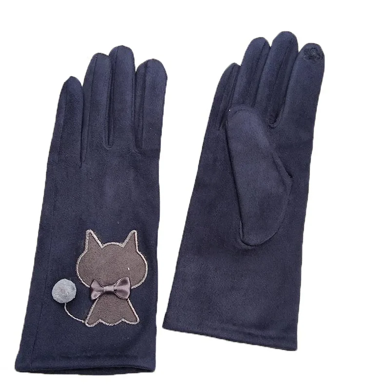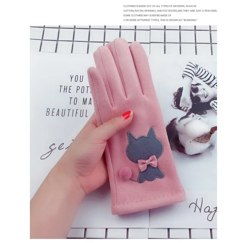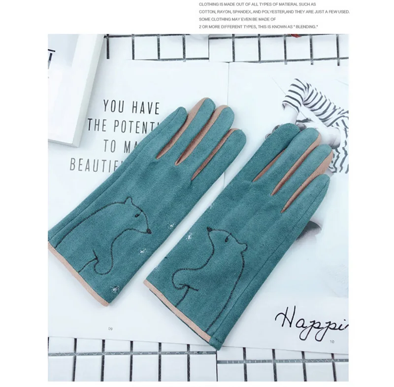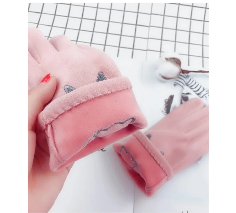 Зимние женские замшевые кожаные бархатные утепленные велосипедные варежки с милым мультяшным котом и вышивкой, перчатки для вождения с сенсорным экраном D92