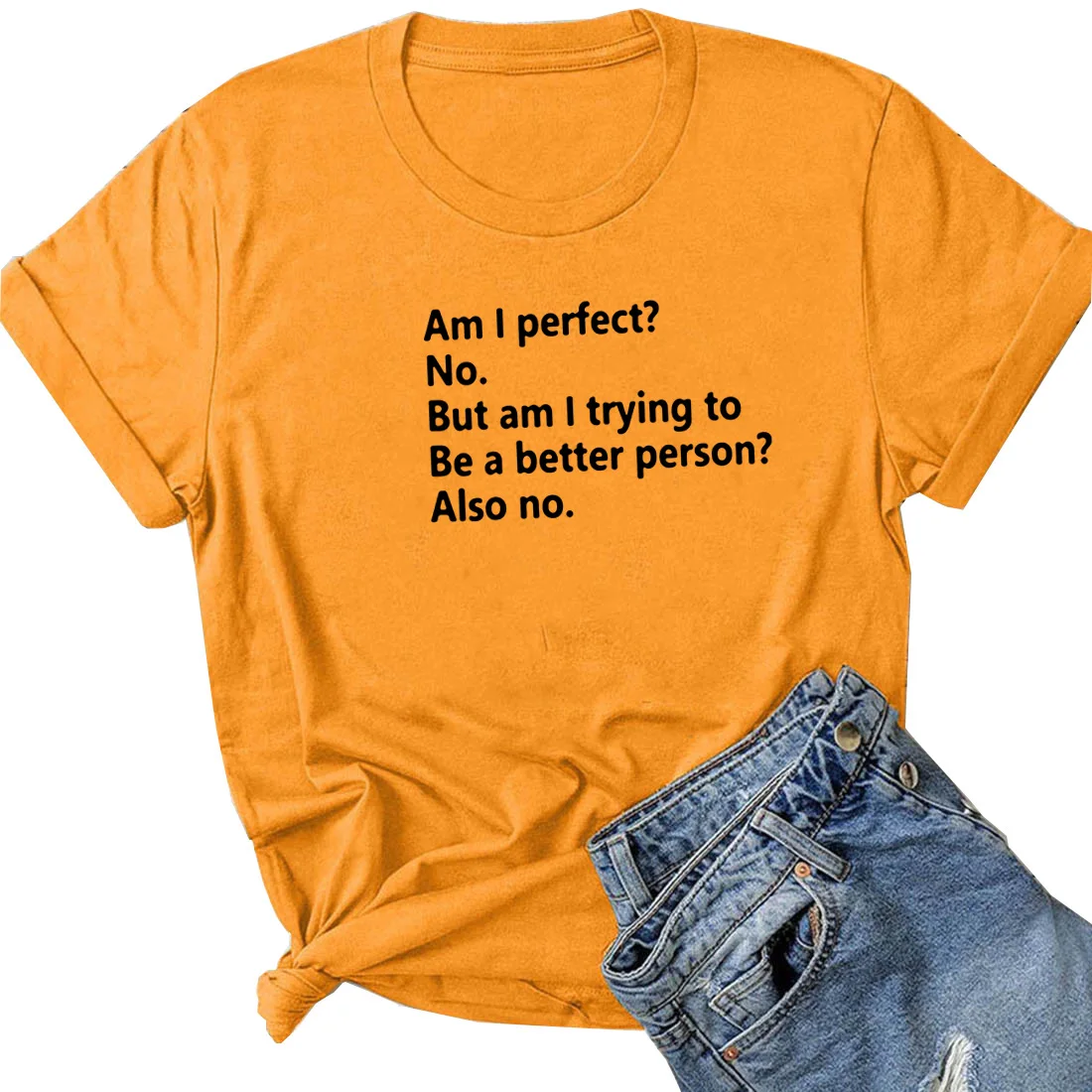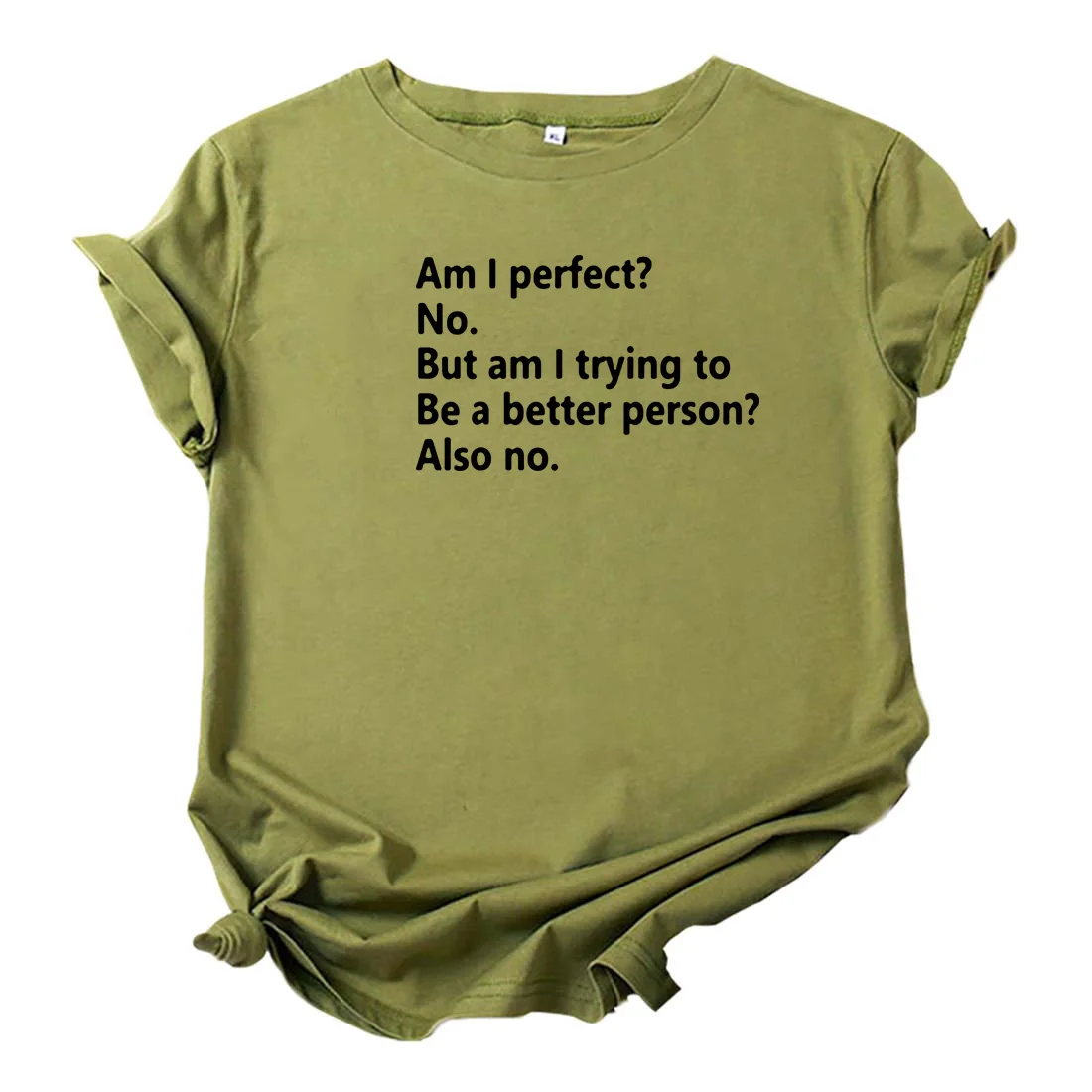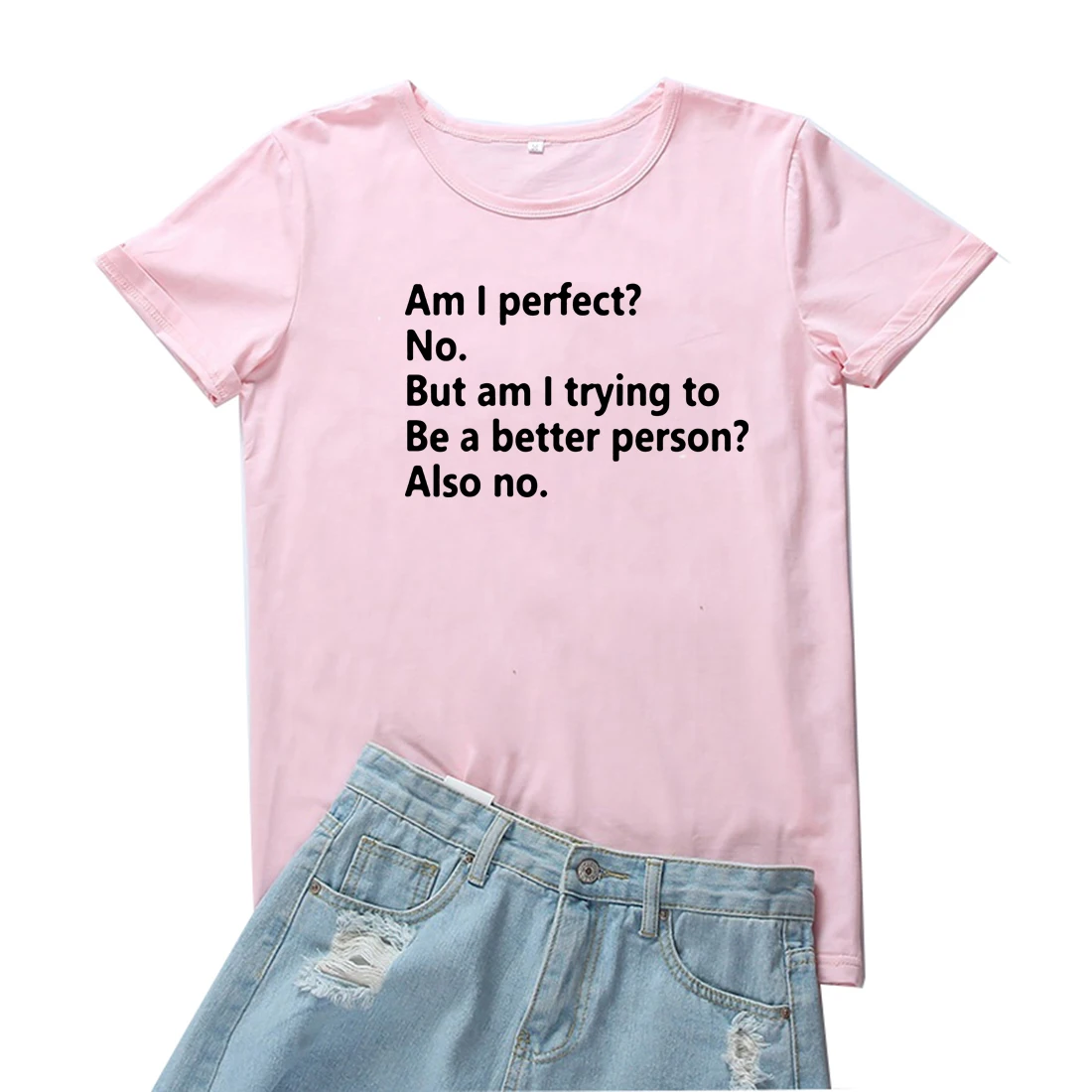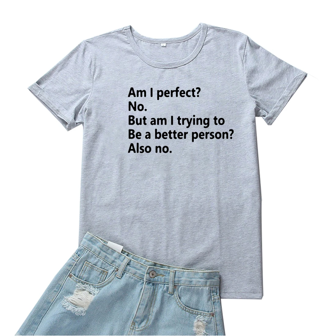 Я идеально, нет, но я пытаюсь стать лучше, а также нет женской футболки, забавная графическая футболка с надписью, женская повседневная женская футболка