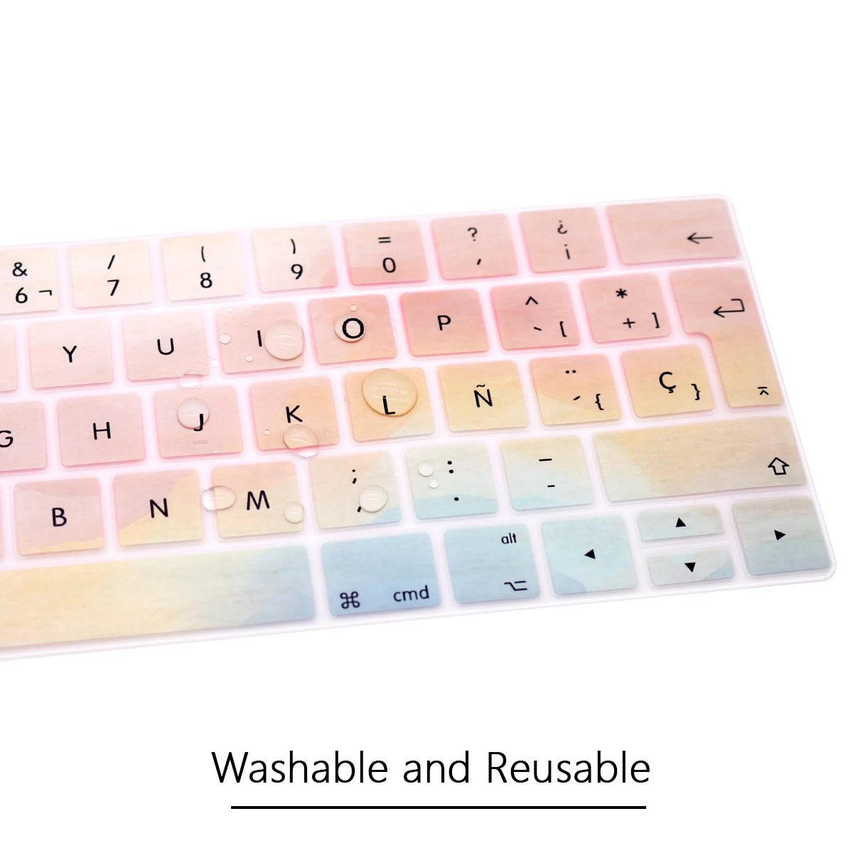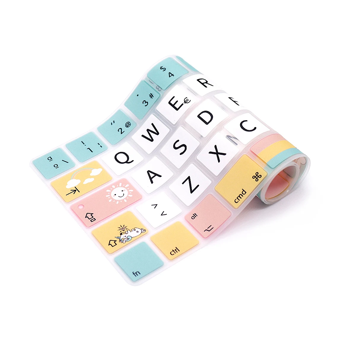 ИспанскийКлючевые слова напечатаны на прозрачном силиконе для длительного профессионального вида, Сверхтонкая кожа облегчает ввод текста, легко наносится и удаляется для очистки или дезинфекции.