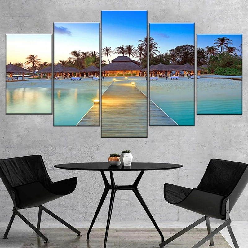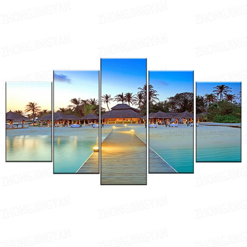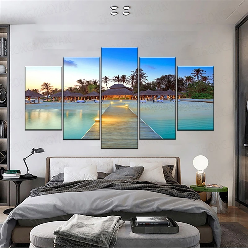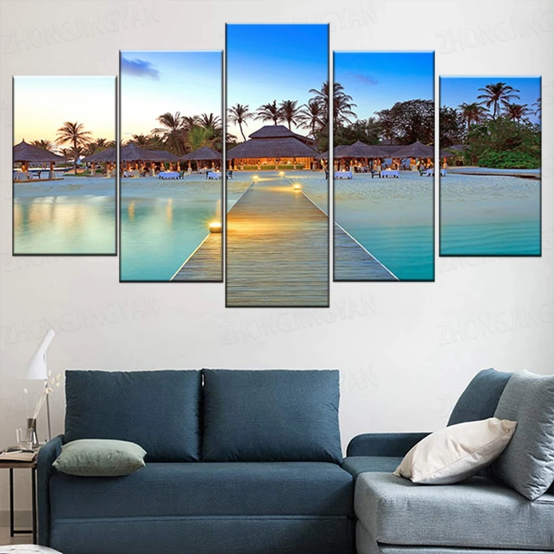 Декоративная рамка для домашней гостиной, 5 шт., морской мост, пальмовые деревья, морской пейзаж, картины HD, печатные модульные картины на холсте, настенное искусство