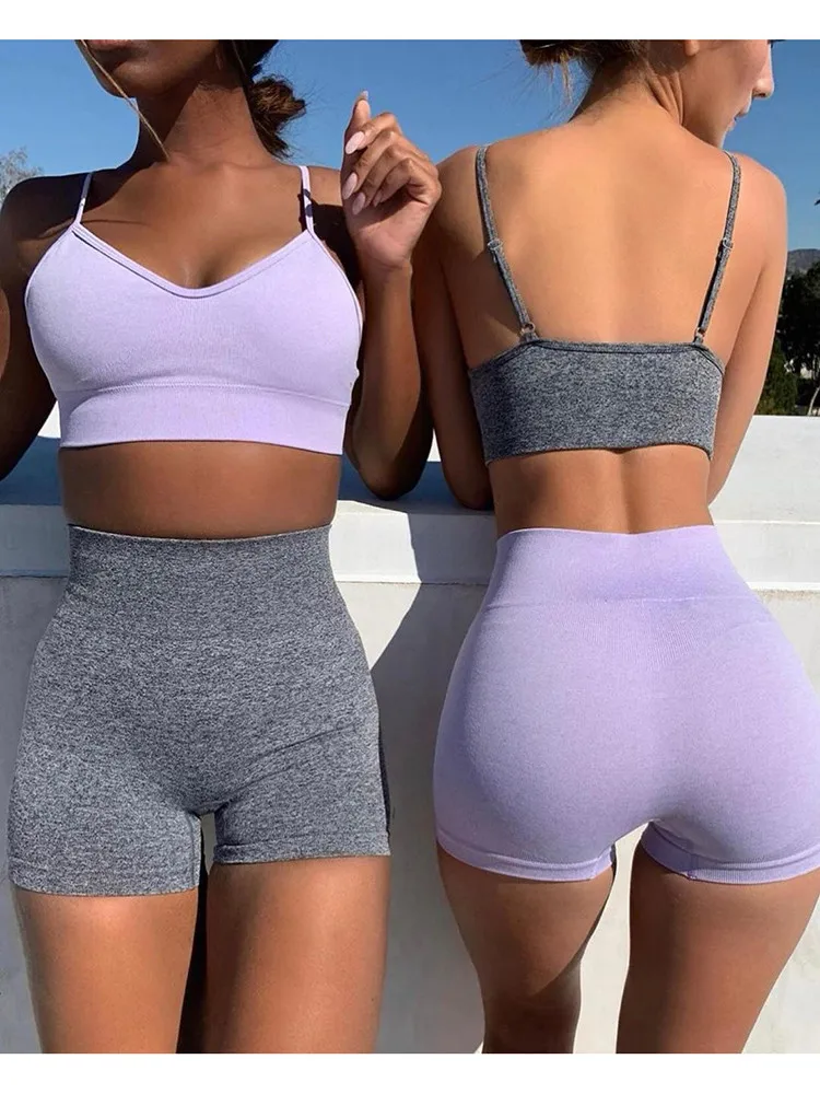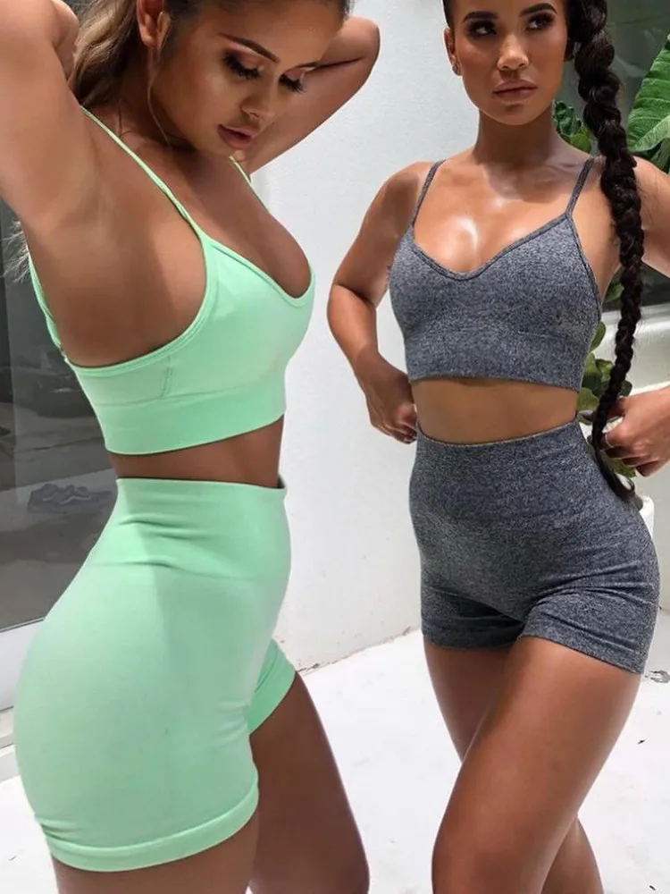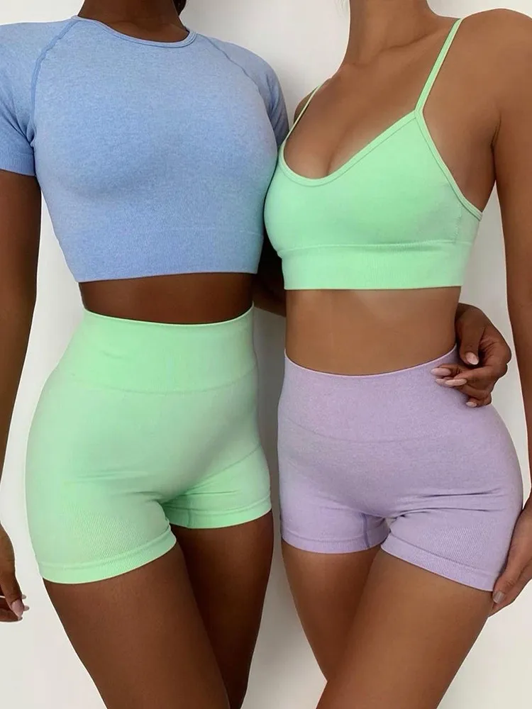 Женские повседневные Костюмы, летний спортивный костюм, бесшовные спортивные комплекты с шортами с высокой талией, тренировочный топ, облегающие леггинсы, Однотонная футболка 2021