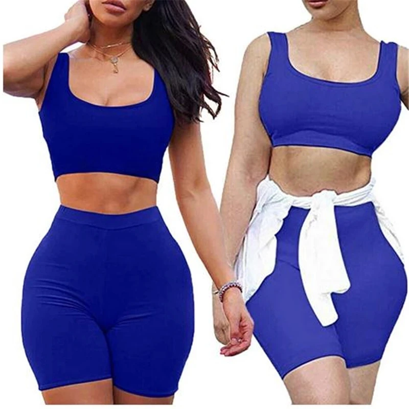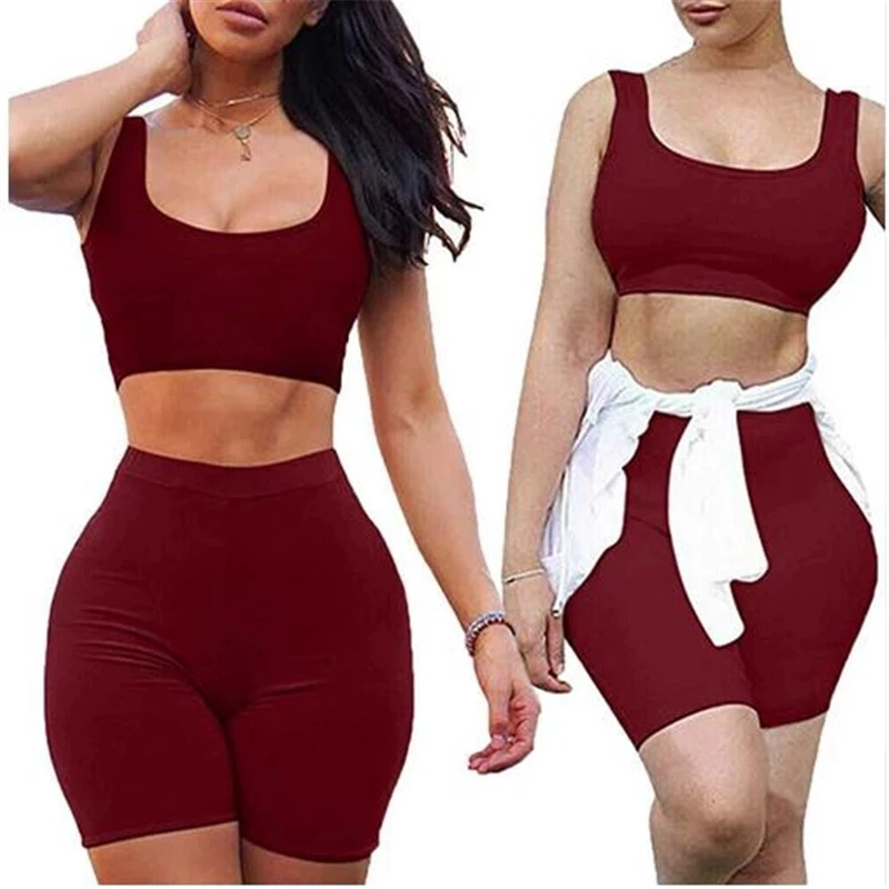 Женский спортивный комплект из 2 предметов, однотонный облегающий Топ без рукавов с низкой грудью, Короткие штаны с эластичной резинкой на высокой талии, комплект одежды для фитнеса