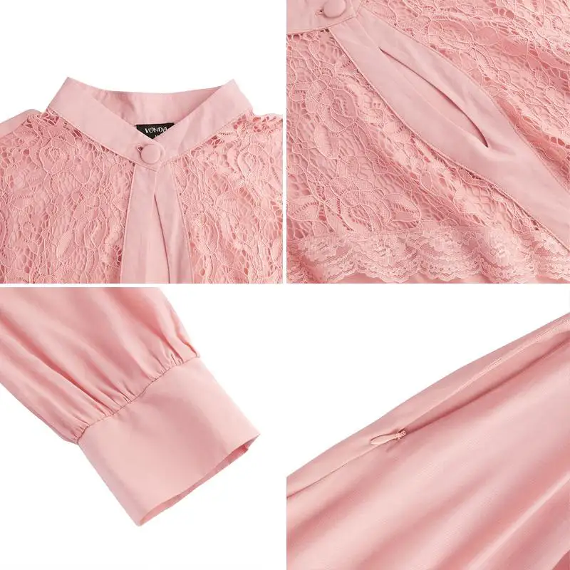 Длинное платье-макси VONDA 2021, женское кружевное платье с воротником-стойкой, повседневное плиссированное платье с рукавом 34, молнией и оборками на подоле, богемное платье