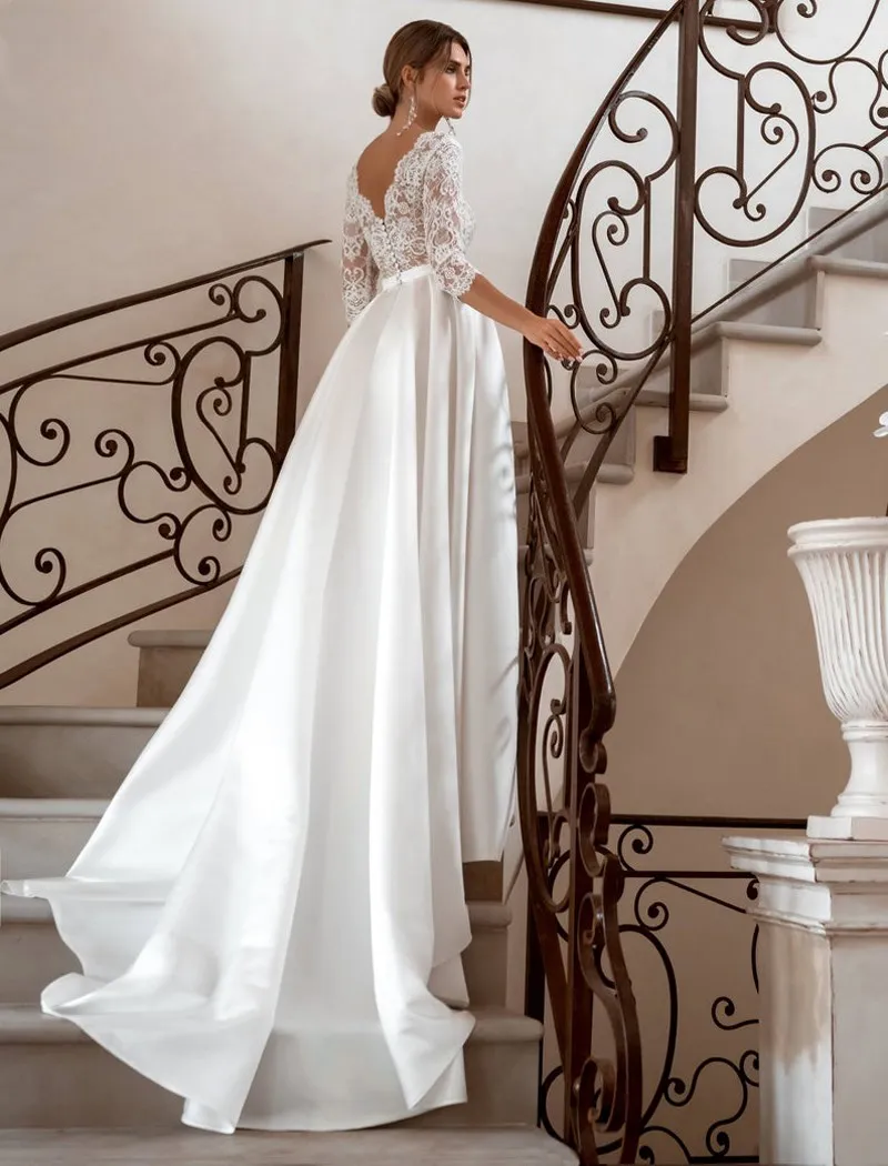 Женское кружевное свадебное платье It's yiiya, белое простое атласное ТРАПЕЦИЕВИДНОЕ платье с длинным рукавом и V-образным вырезом на заказ на лето 2021