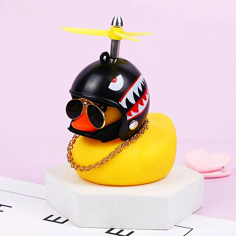 Особенности: он издаст звук при защемлении, материал мягкий, безопасный и прочный, качество утки хорошее, сырье безопасно, и оно не вредит здоровью человека, С шлемом, винтом, солнцезащитными очками, металлической цепочкой для ожерелья, супер круто. Отлично подходит для надевания на автомобильный капот, зеркало заднего вида и т. д. также можно надеть детский шлем, когда они катаются на роликах, это действительно восхитительно.