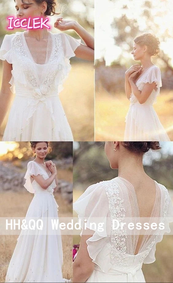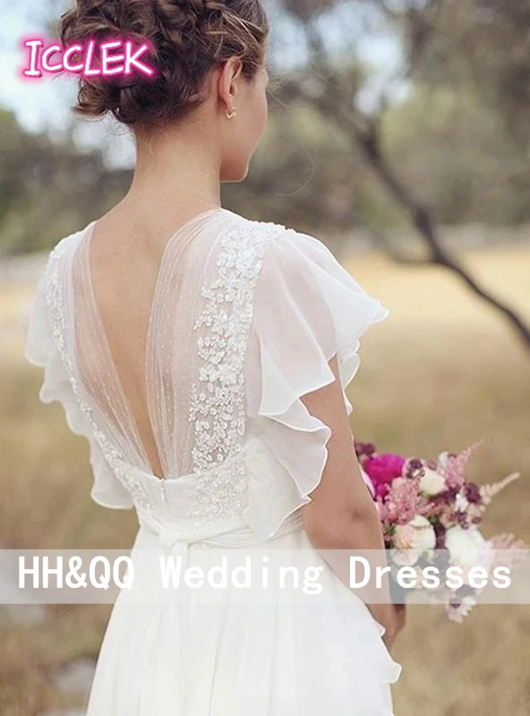 Шифоновое свадебное платье с открытой спиной, рукавами-воланами и аппликацией