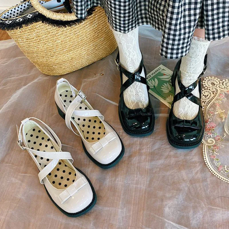 Туфли женские из лакированной кожи, туфли-лодочки в стиле ретро, с перекрестной шнуровкой, с ремешком и пряжкой, с бантиком, Туфли Мэри Джейн, 9237C