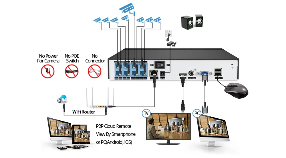 Простая настройка, всего 4 шага для просмотра на мобильный телефон,Просмотр видео в режиме реального времени в системе из любого места и в любое время с помощью смартфона, стола или ПК с передовой технологией P2P, вы можете получить удаленный доступ к вашей системе в течение нескольких минут или меньше, нет необходимости в переадресации, удаленный доступ никогда не был таким простым!