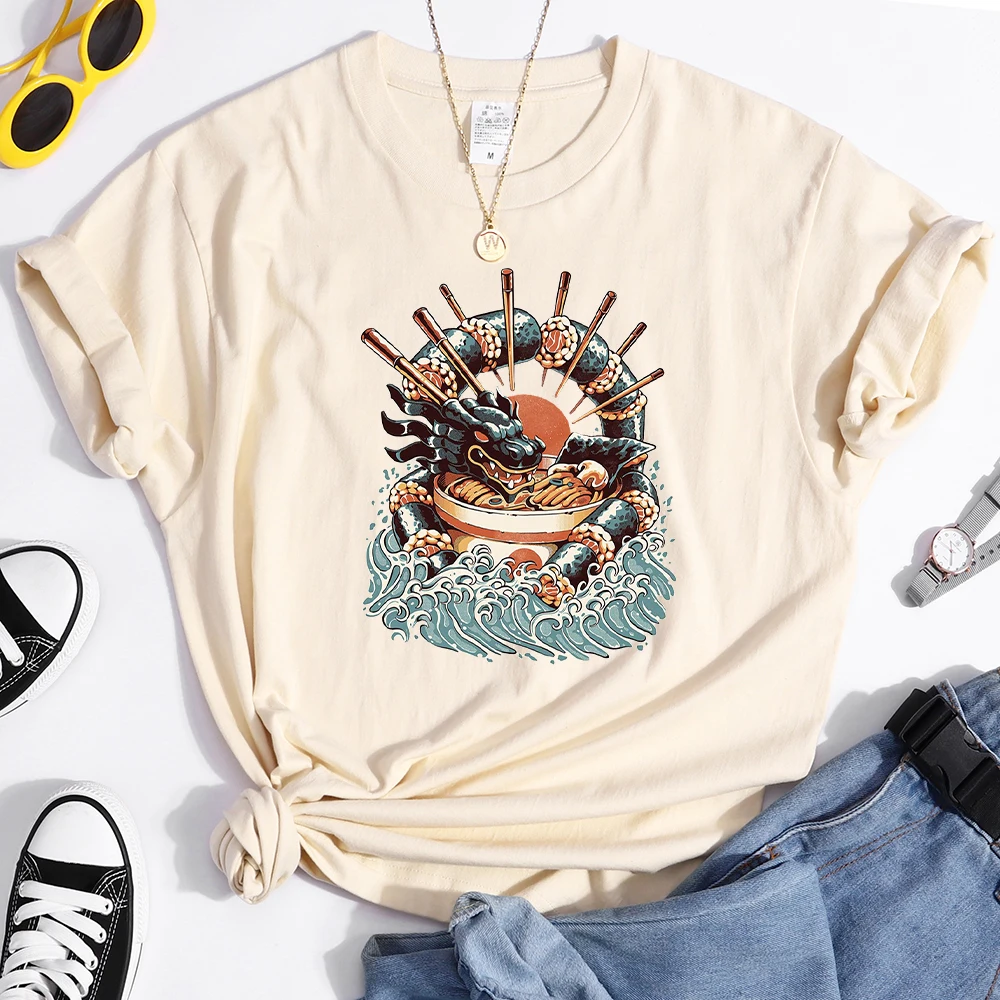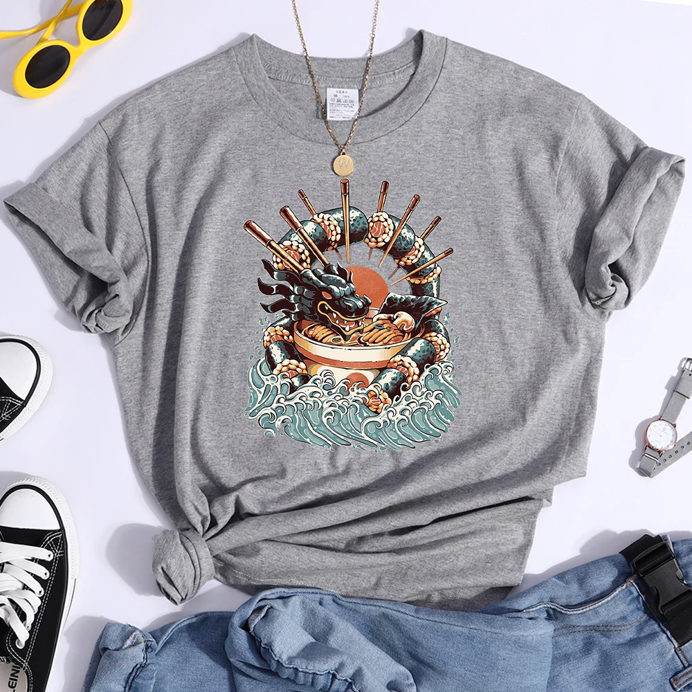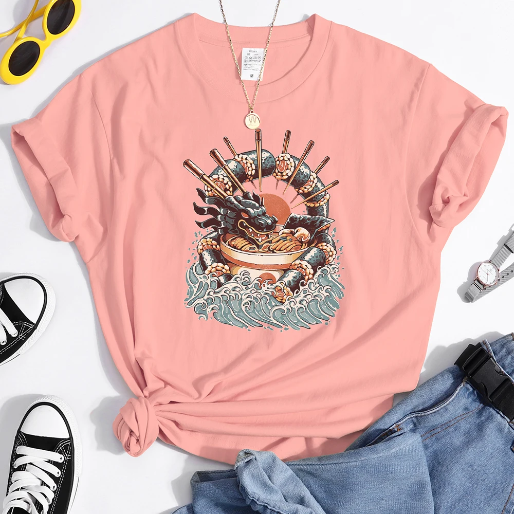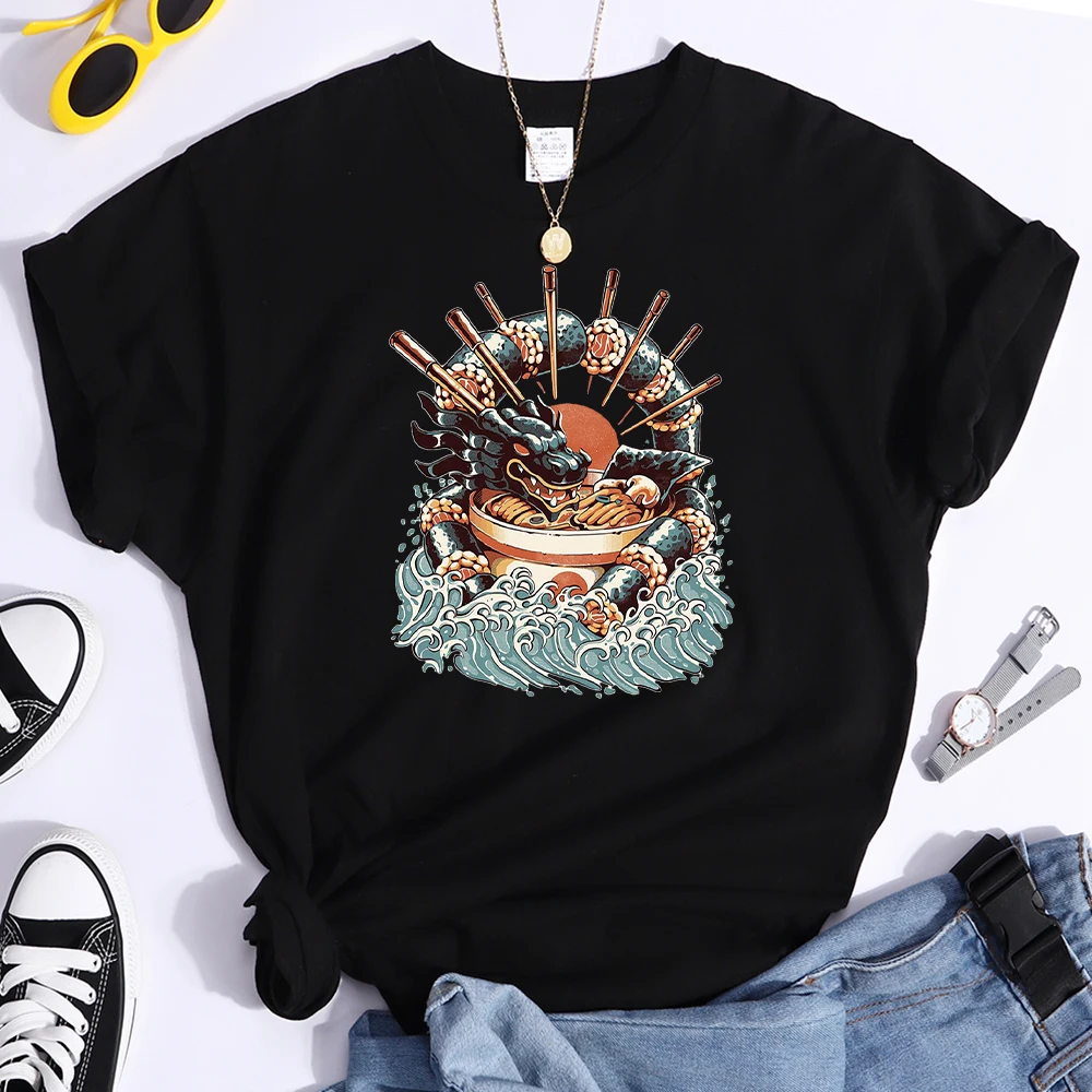 Футболка женская в стиле оверсайз, Модная стильная рубашка с круглым вырезом в стиле укиё-э, с рисунком суши и рамен-дракона, летняя одежда в стиле Харадзюку