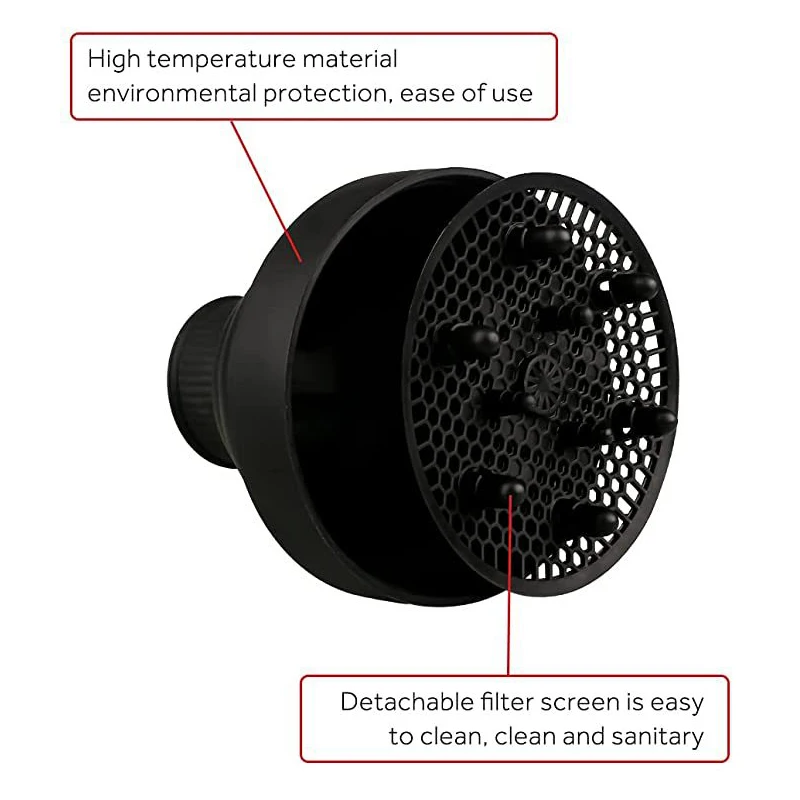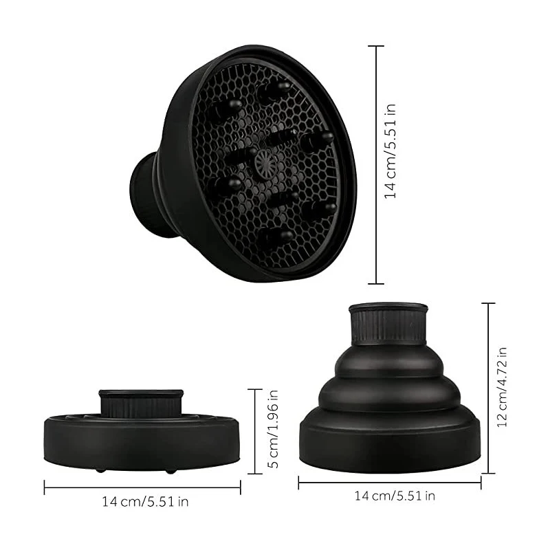 Особенности:Состояние на 100% абсолютно новыйТип изделия: диффузор для фенаФункция: равномерно распределяет тепло и воздух от сушилки на волосахМатериал: силиконДиаметр: 6 см/2,4 дюймовРазмеры: 13,8*11,5 см/5,4*4,5 дюймов (как показано на рисунке)Подходит для: 4 ~ 5 см диаметр насадки фена
