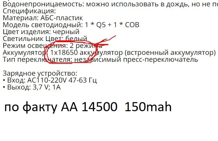 фонарик светит 7 минут, начал разбираться, оказалась аккумулятор не 18650 как на странице у продавца, a 14500. нет режимов слабой подсветки, ремешок очень слабый не как на странице продавца. Продавец обманывает покупателей. (мошенничество)