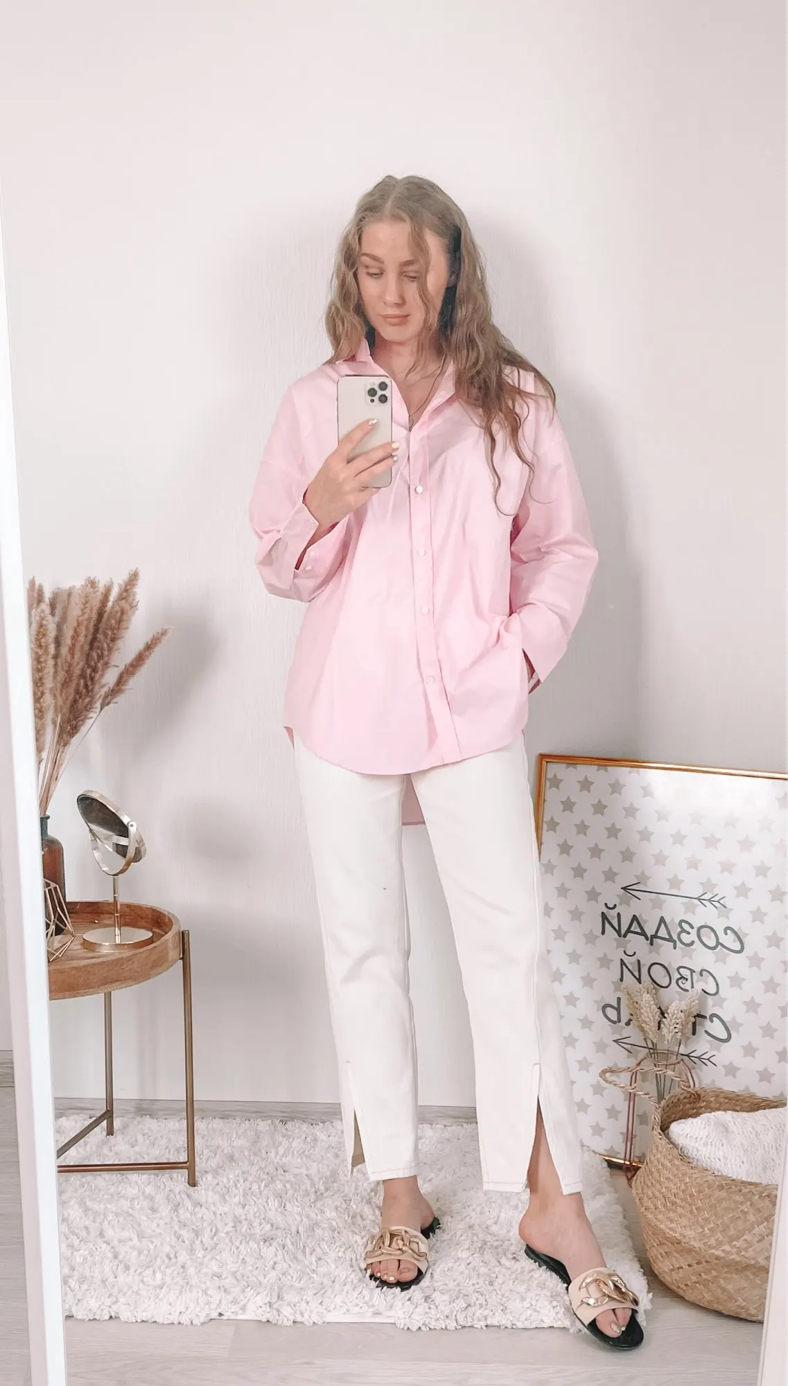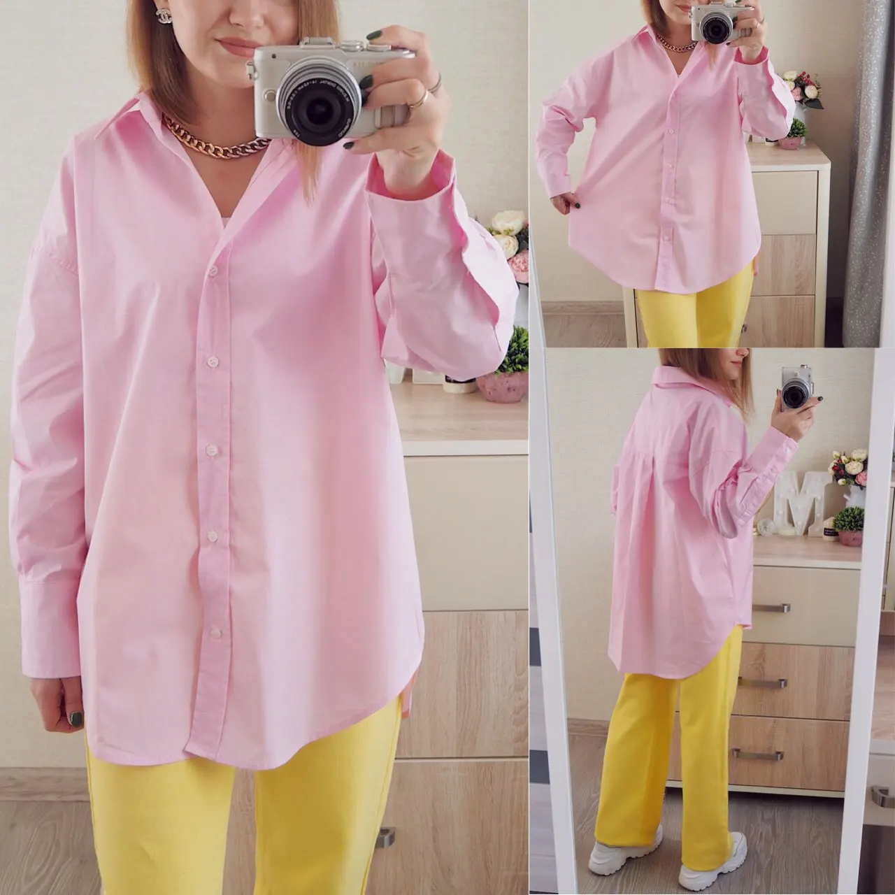 Отличная рубашка с бирками за** материал идентичен, брала в розовом цвете, он не слишком яркий, а нежный, пастельный. Материал приятный к телу, хлопок и полиэстер с хорошем соотношении. Размер L довольно объемный, если не любите оверсайз, то берите свой размер, не маломерит.