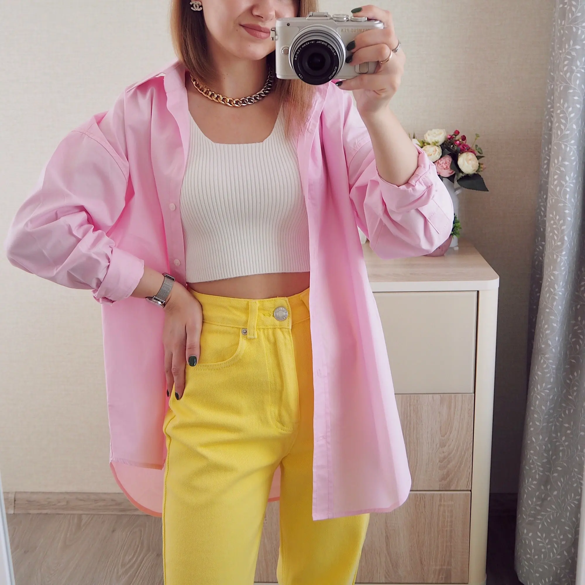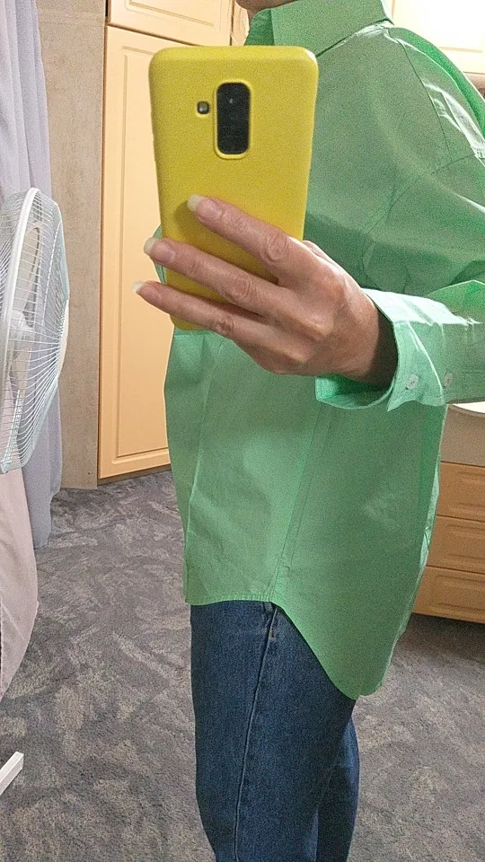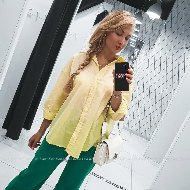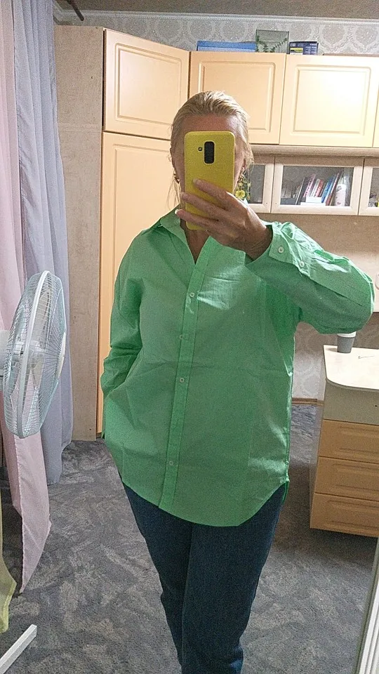 Рубашка свободного кроя в 6 цветах. Доставка до Москвы две недели. Крой свободный, как «рубашка бойфренда». Цвет - желтый. Заказала себе в размере Л. Рубашка села хорошо и рукава не короткие. Мои параметры: рост 175, плечи 38, ог92. В составе ткани преобладает хлопок (мнётся и гладится не просто). Но, в жару в рубашке очень комфортно. Плотность ткани средняя, контрасного цвета белье будет видно. Пошив хорошие, есть торчащие ниточки немного.