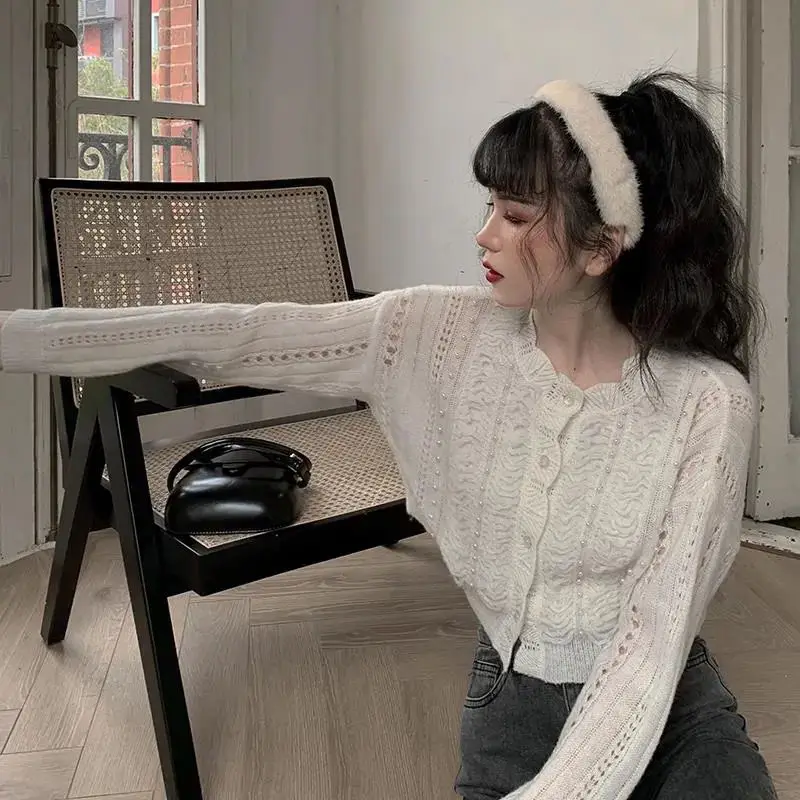 Кардиган Для женщин белое платье с прорезями на Нежный жемчужно-кнопка Однобортный ретро короткий свитер мягкая элегантная Ulzzang одежда женская Ins