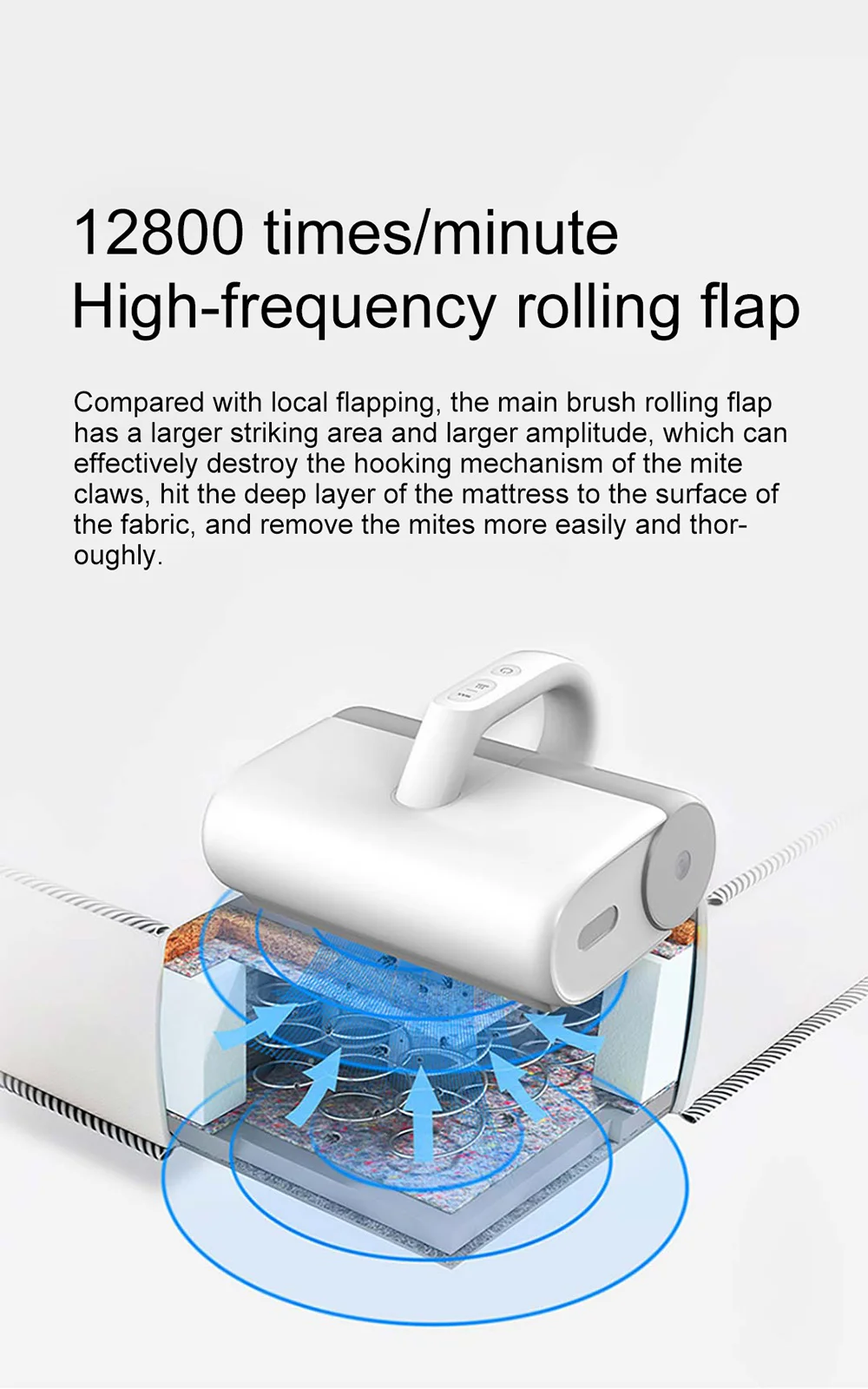 Прецизионный высокоскоростной бесщеточный двигатель, высокоэффективный выход 16000 ПА супер сильное давление ветра, сильная мощность непосредственно к глубокому волокну матраса, значительно продлевает срок службы инструмента для удаления клещей от домашнего уровня до профессионального уровня, и эффект всасывания виден невооруженным глазом.