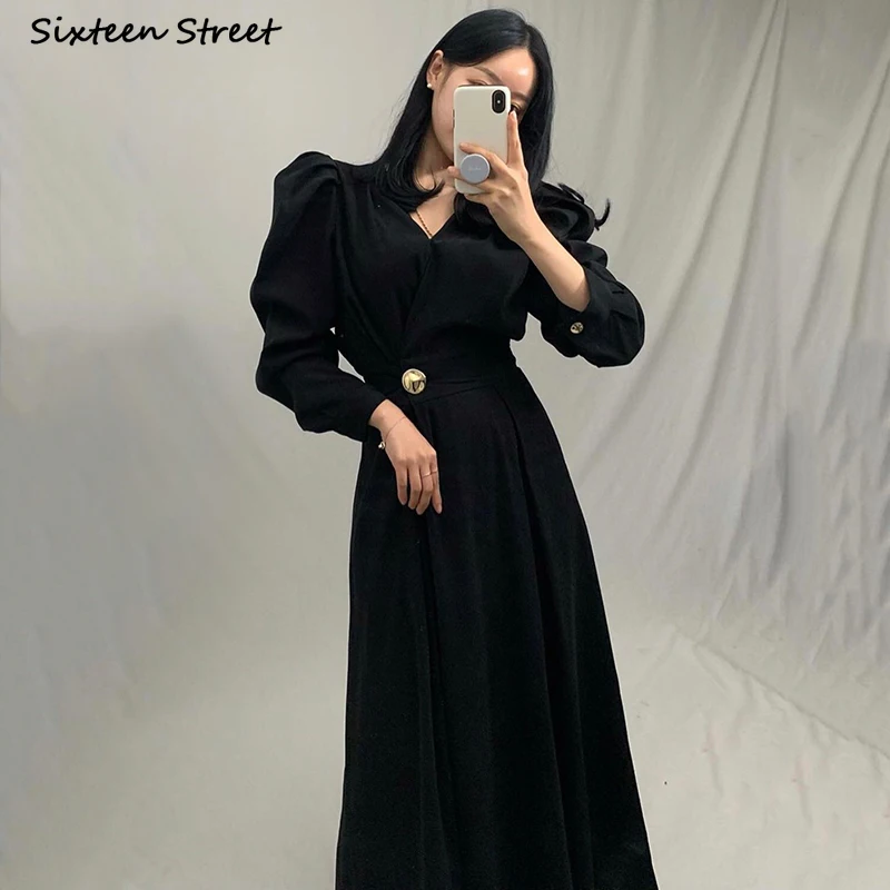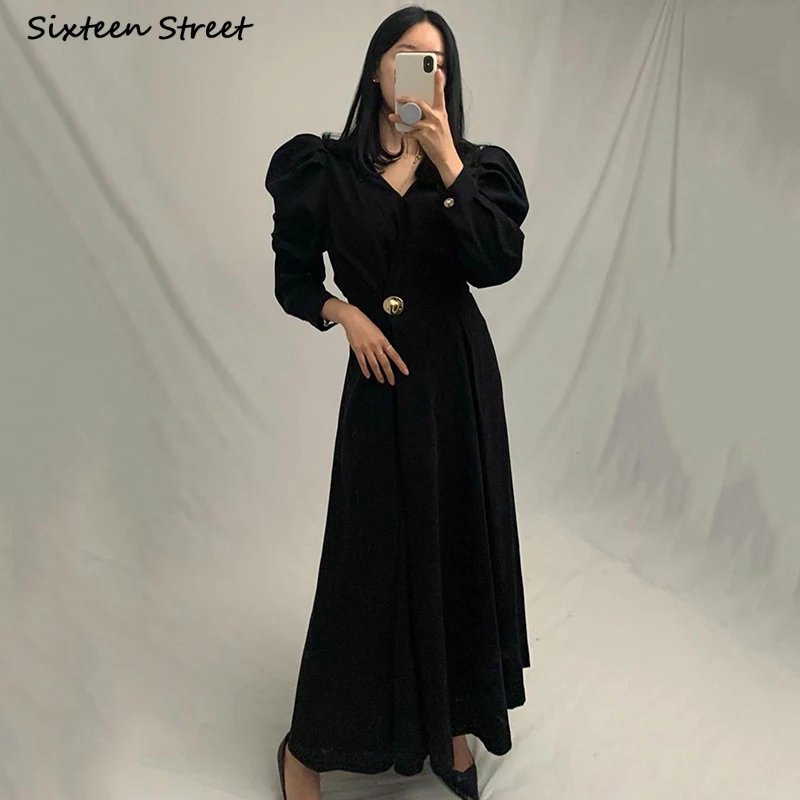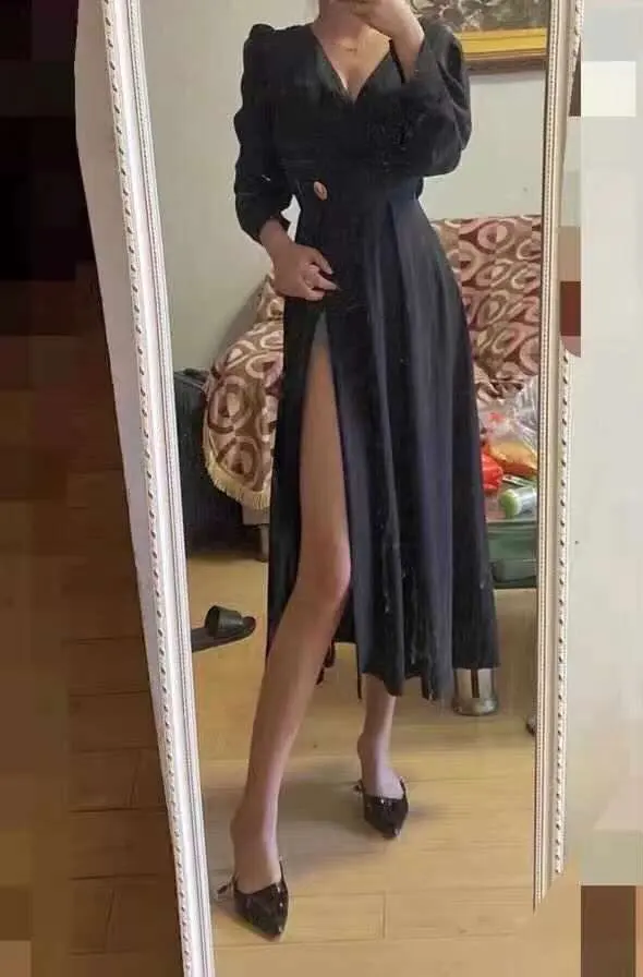 Осенне-зимнее черное платье на золотых пуговицах для женщин, шикарн...