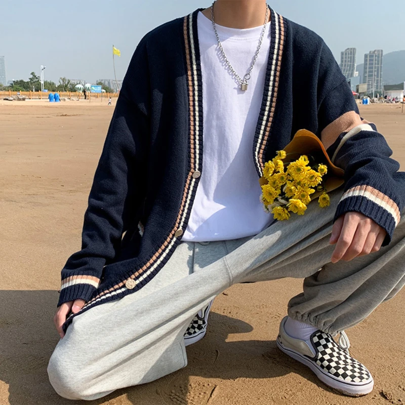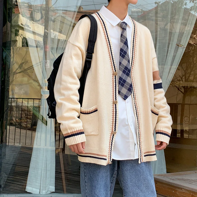 Кардиган мужской простой полосатый в стиле пэчворк с V-образным вырезом в стиле преппи однобортный с карманами DK Униформа студенческие Топы BF Универсальный