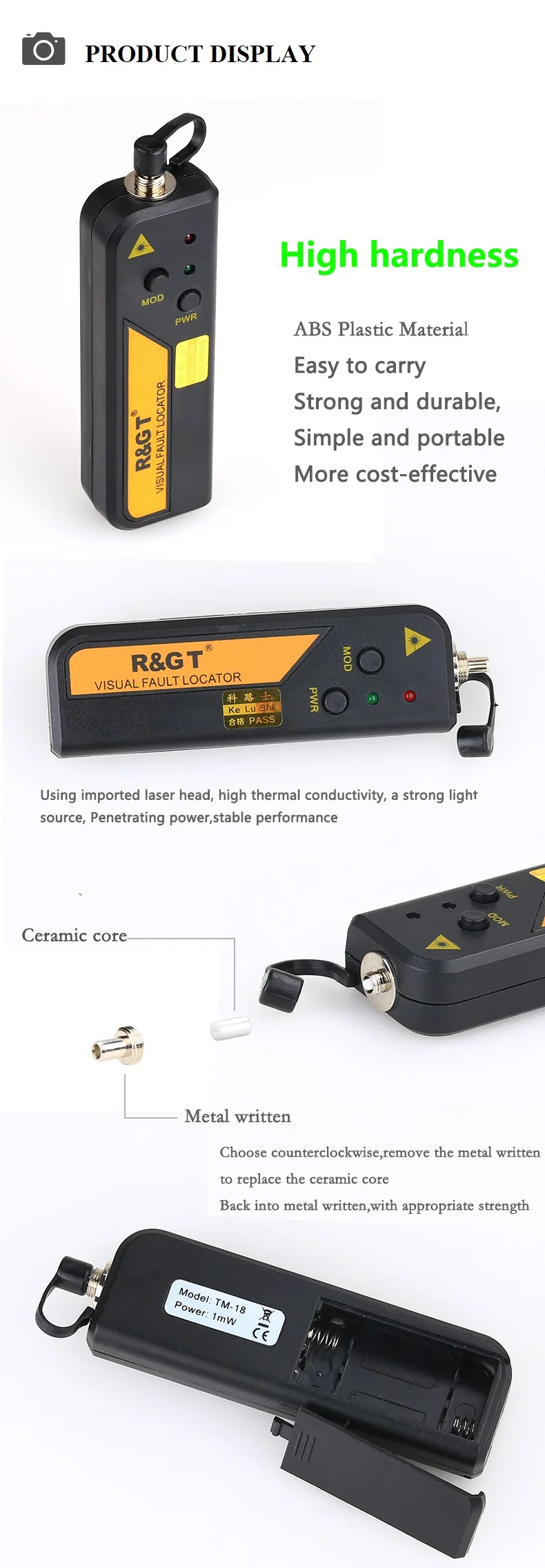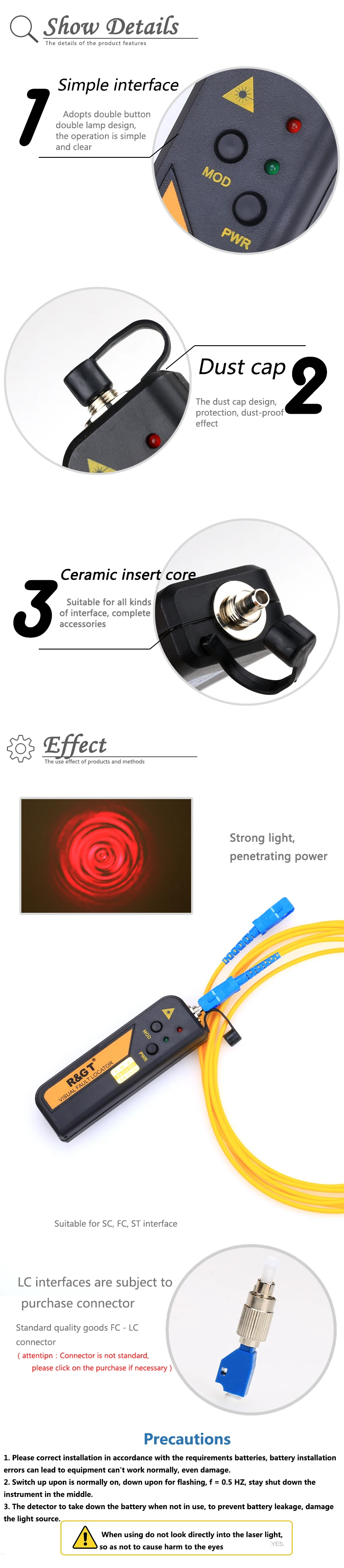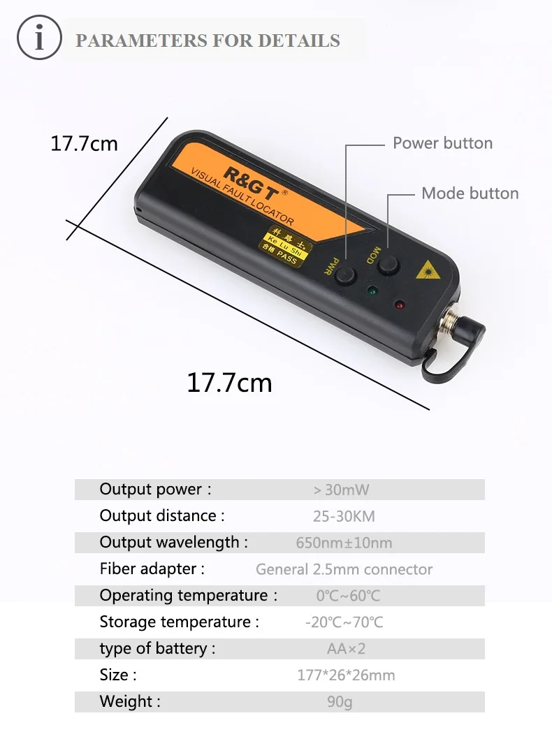 2,5 мм универсальный разъем, для 1,25 мм разъемов, FC (папа)-LC (Female) адаптер также может быть предоставлен по запросу.1. Работает в режиме CW или импульсного2. Постоянная выходная мощность3. Предупреждение о низком заряде батареи4. Длительный срок службы батареи (до 60 часов)5. Ударопрочный и пыленепроницаемый дизайн для лазерной головки6. Чехол с лазером предотвращает повреждение ОУР7. Тестирование горения t ensur надежность8. Портативный и прочный, простой в использовании9. Гарантия по стандартам CE включает EMS, EMI, ROHS Характеристики:1. Длина волны: 650 нм2. Выходная мощность: 30 мВт3. Разъем: общая 2,5 мм разъем (SC/FC/ST)4. Частота: 1 Гц5. Мощность: 1,5 v * 2 батареи типа AAA (в комплект не входит аккумулятор.)6. Рабочая температура: от-10 до + 457. Размеры: 118*33,6*19,2 мм8. Диапазон: 20-30 км9. Материал: пластиковый корпус