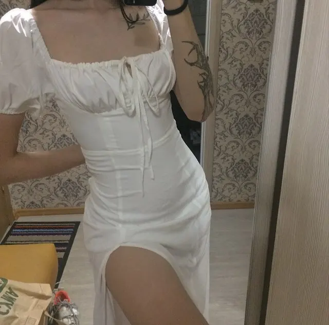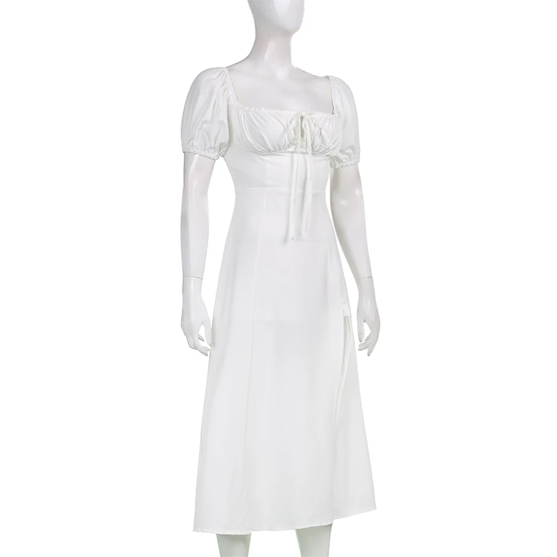Винтажное платье для вечеринки, элегантные белые длинные платья с коротким рукавом-фонариком, пикантные стильные наряды с высоким разрезом и шнурком, 2022
