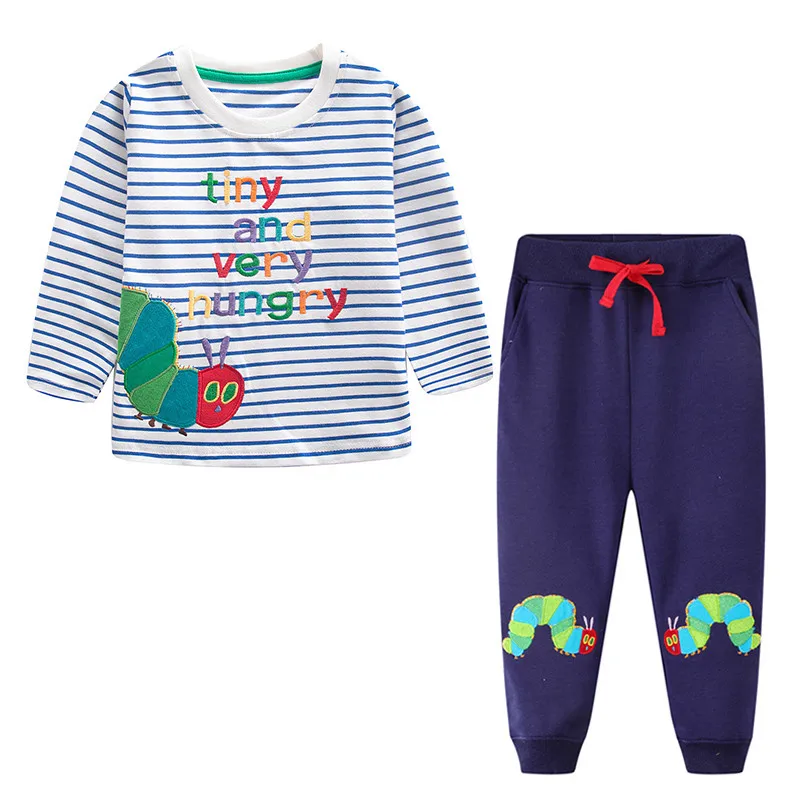 Прыжки метров Новое поступление осень-весна Caterpillar с вышивкой для мальчиков и девочек, комплекты одежды с длинным рукавом, топ + нижняя одежда для детей