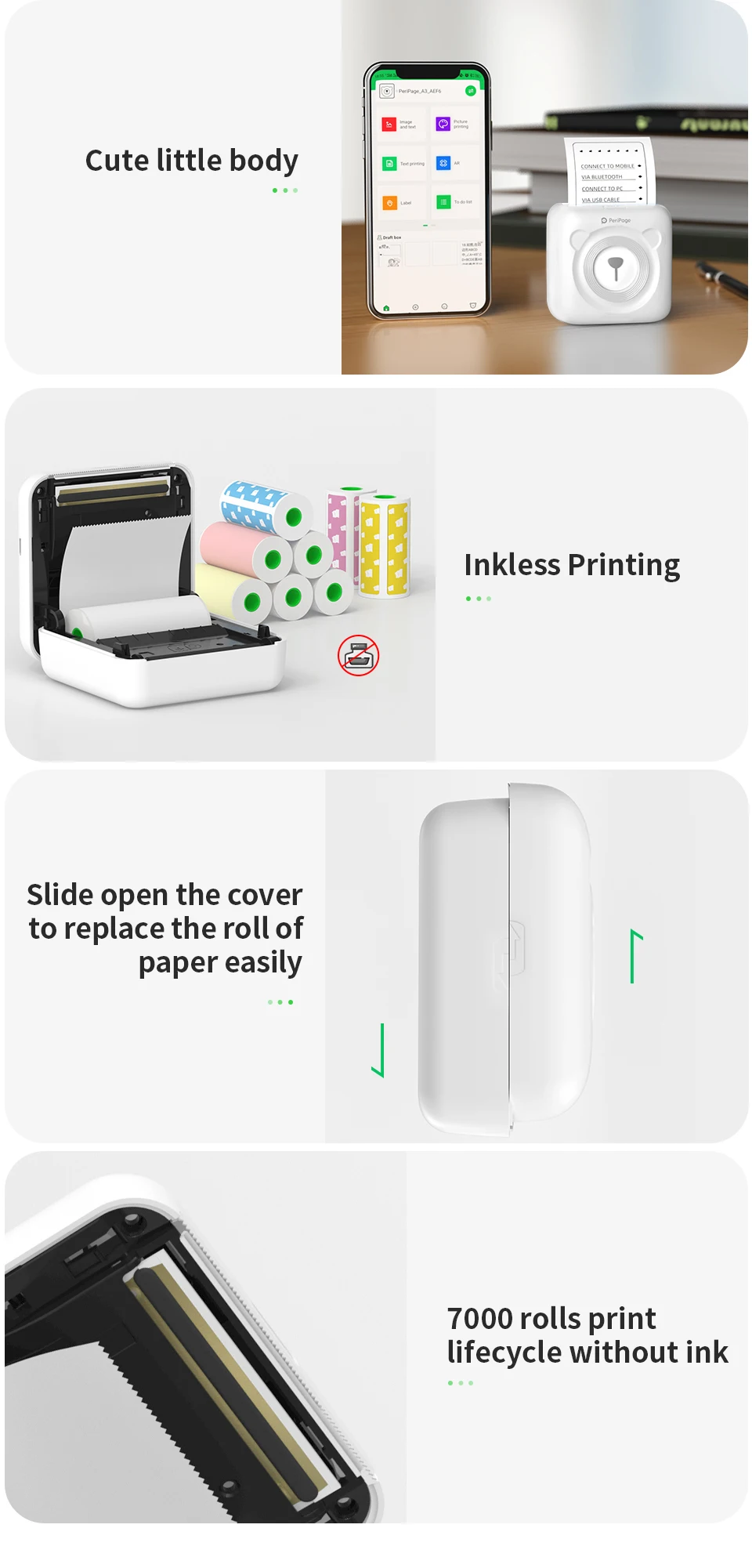 1. Скорость печати: 90 мм/сек. Макс.2. Разрешение: 203 точек/дюйм интерфейс3. Печатные материалы: термальная бумага4. Напряжение принтера: 100-240 В5. Максимальный размер бумаги: 58 мм * 30 мм6. Размеры изделия: 79*79*42 мм7. Вес нетто: 0,16 кг8. Упаковка: 1х машина Peripage; 1х линия передачи данных; 1х упаковочная коробка; 1х Руководство пользователя