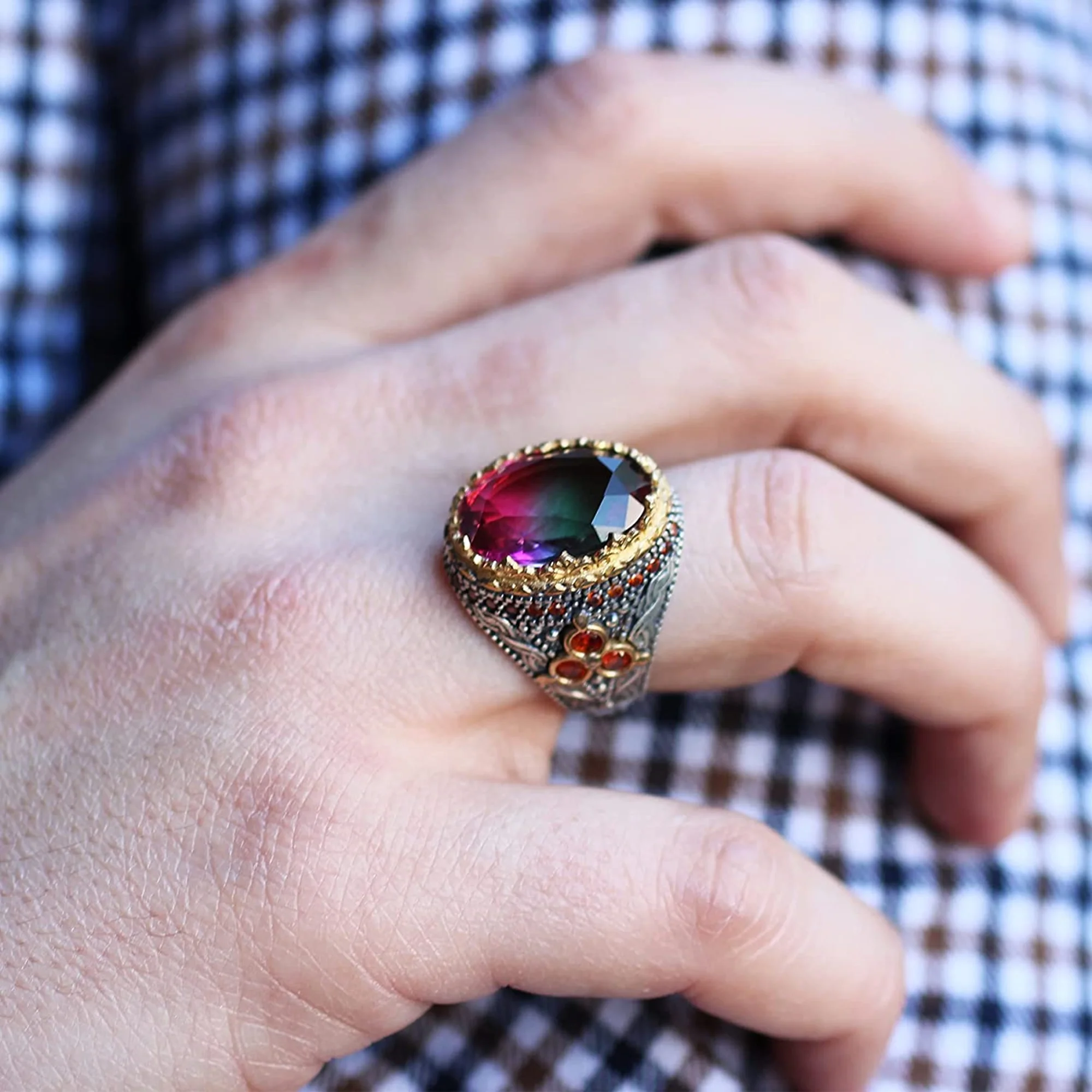 Мужское кольцо из серебра 925 пробы с турмалином и арбузом