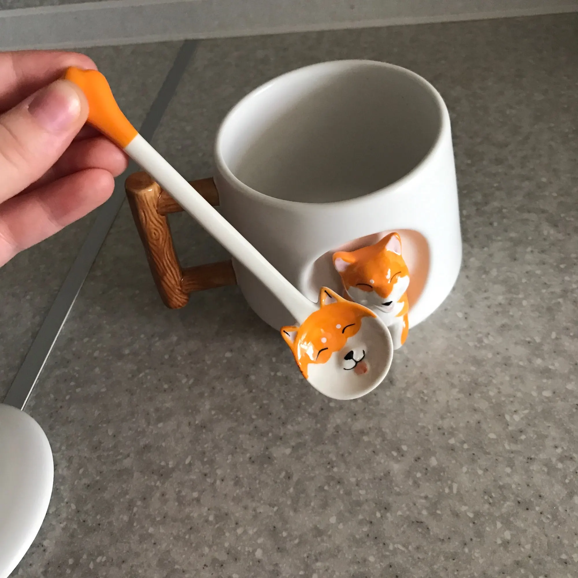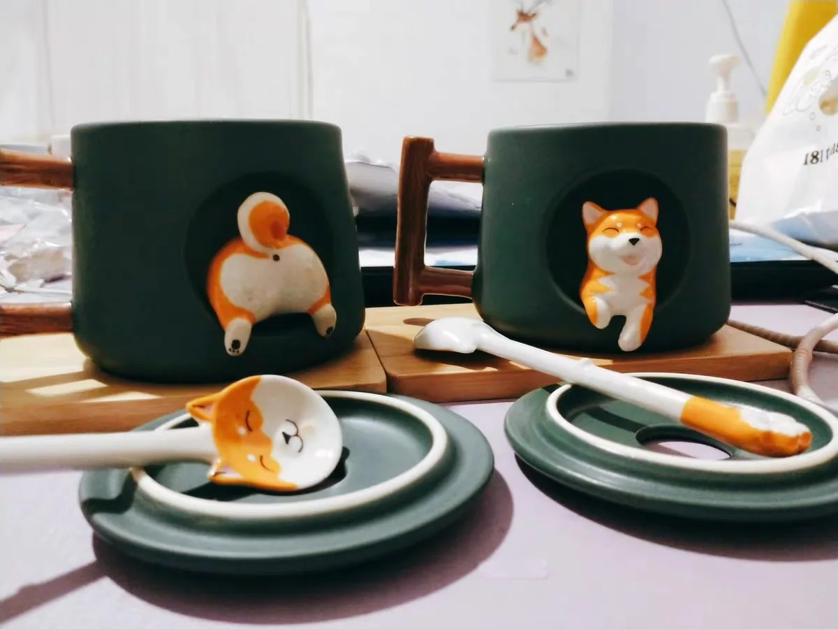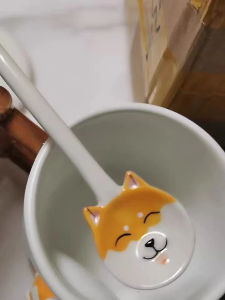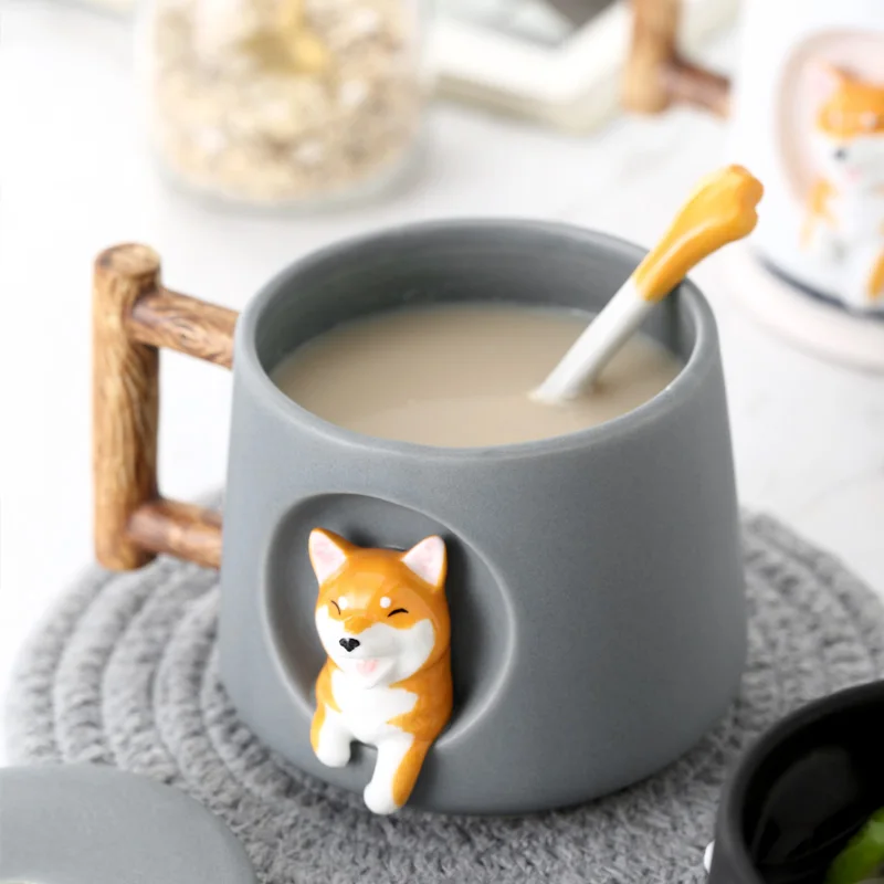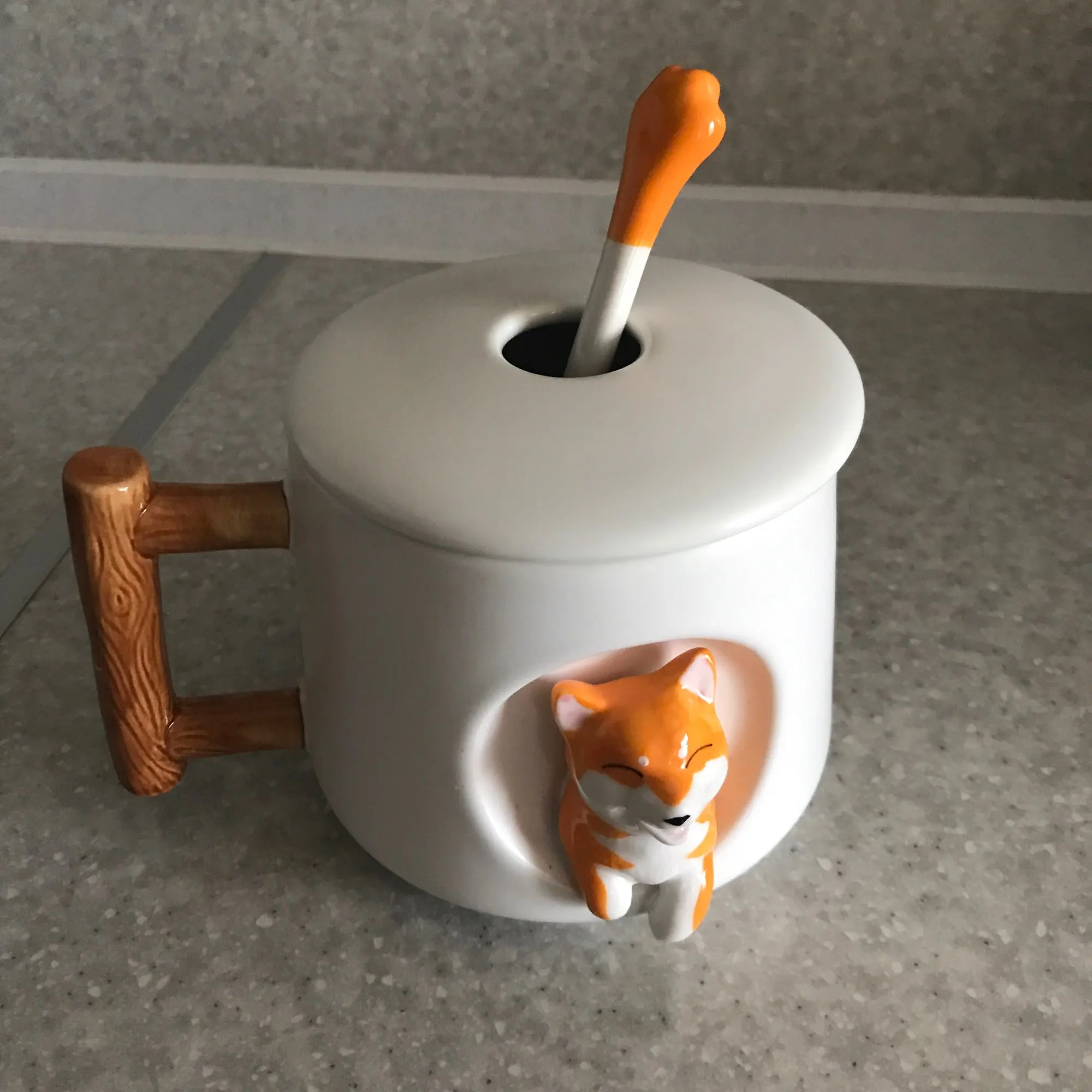 Мультяшная керамическая кружка, милая 3D Шиба-ину, рисунок с крышкой, ложкой, любимый подарок для девушек, для молочного чая, для пары