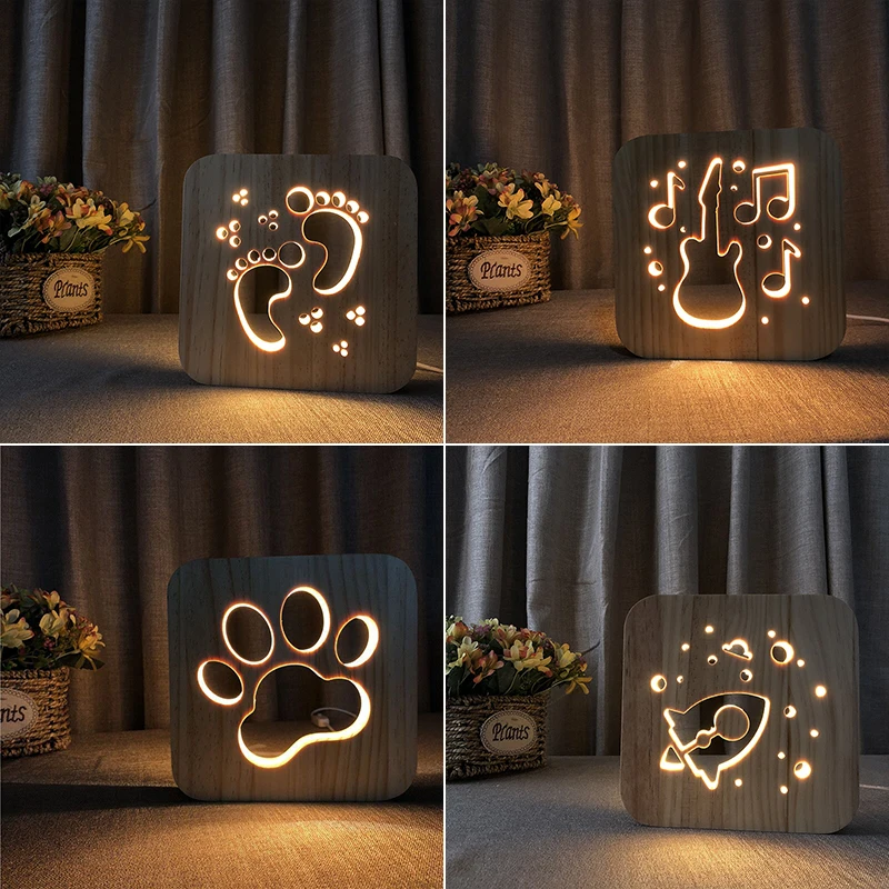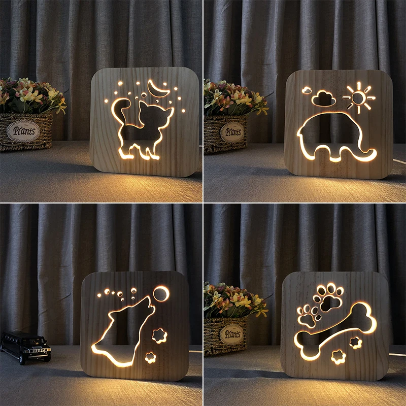 Светодиодный USB Ночной светильник, деревянная собачья лапа, кошка, голова волка, животное, лампа, новинка, детская спальня, 3D украшение, настольный светильник, подарок ребенку